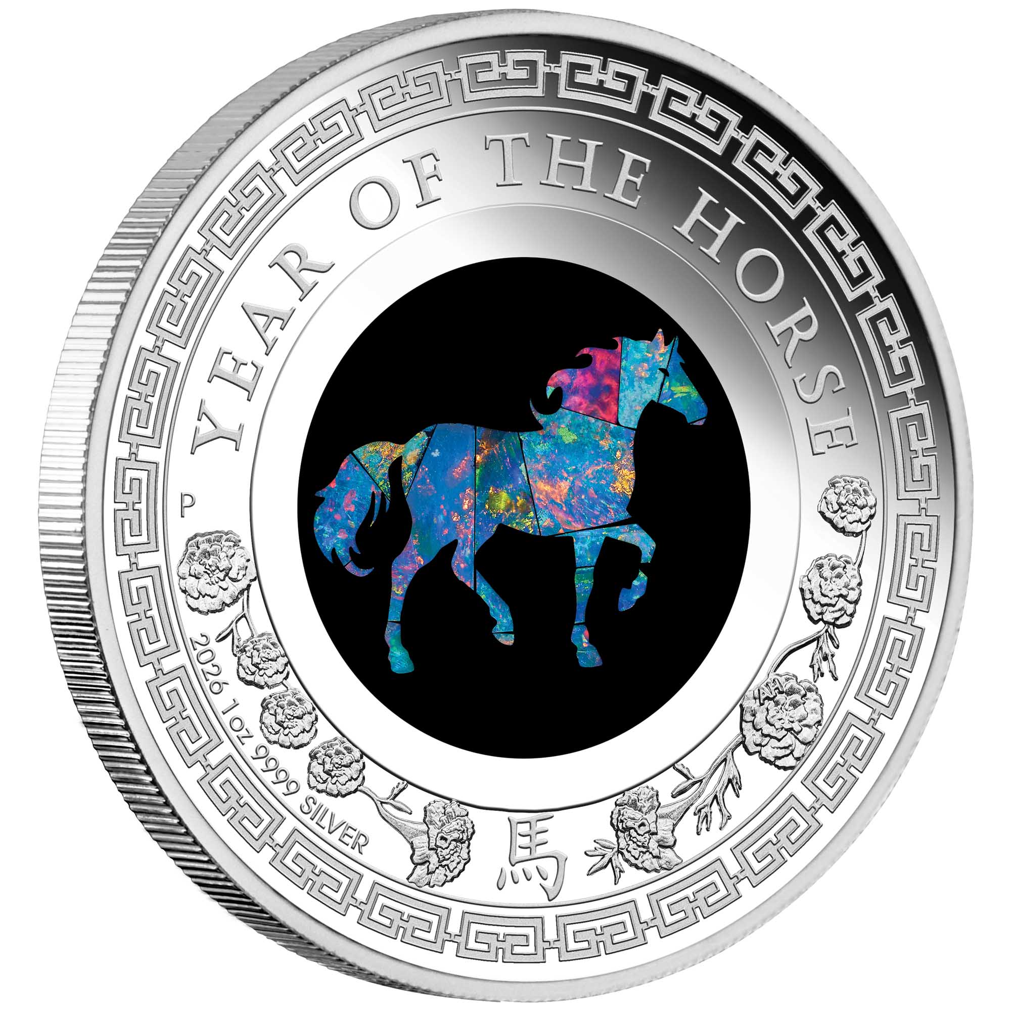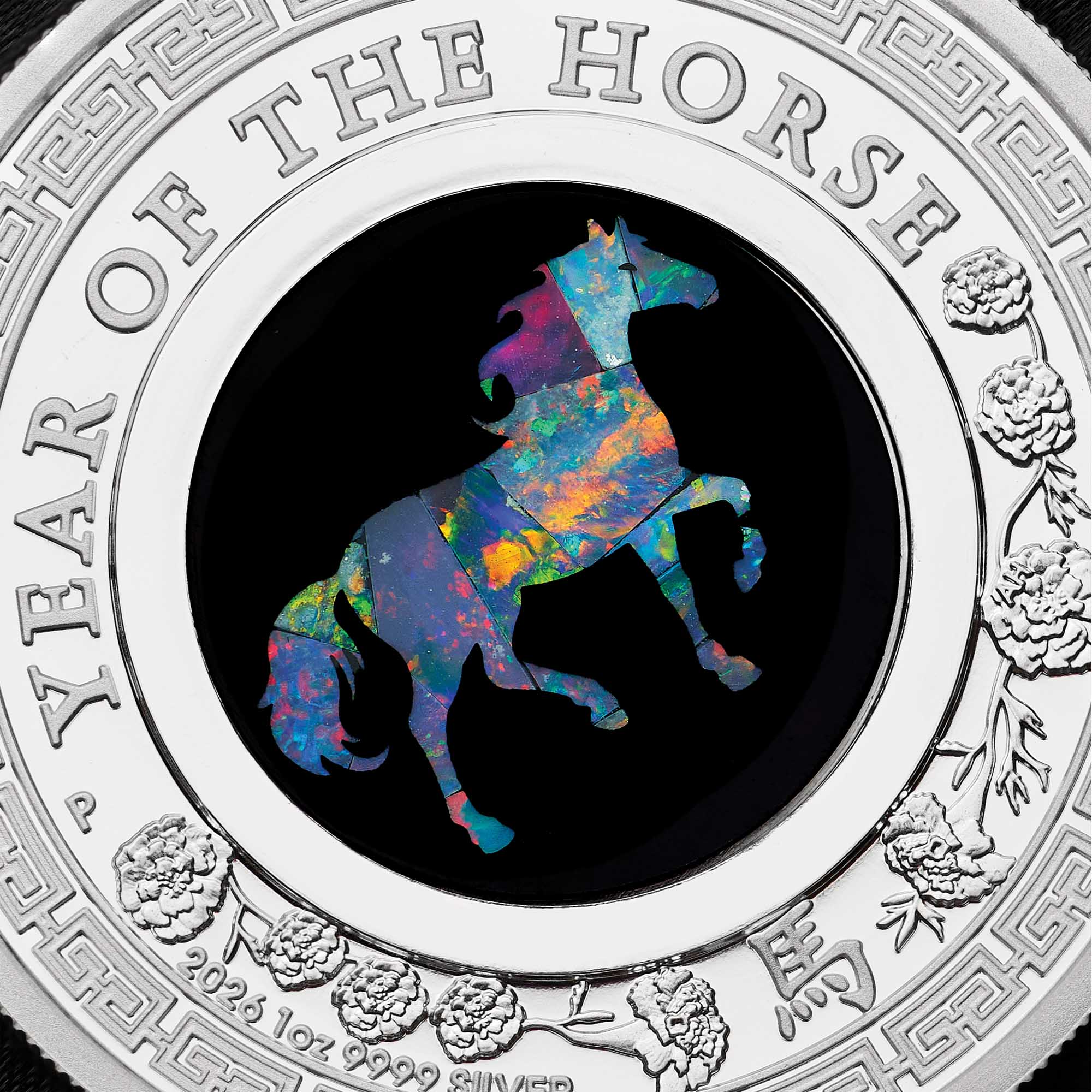 The coin’s reverse incorporates a circular panel featuring a horse detailed in pure Australian opal. Struck elements include intricate patterning with stylised depictions of marigold, a plant traditionally considered lucky for those born in the Year of the Horse. The design also includes the inscription ‘YEAR OF THE HORSE’ and the Chinese character for ‘horse’ together with the 2026 year-date, the coin’s weight and purity, and The Perth Mint’s ‘P’ mintmark.
