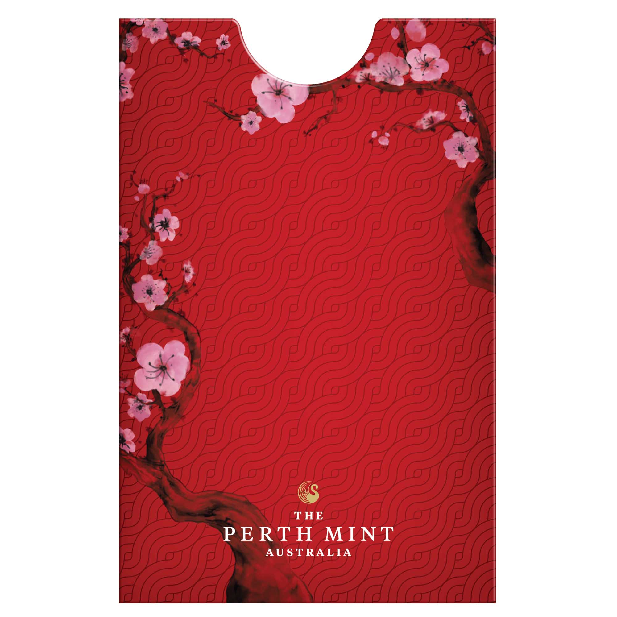 This minted bar is housed in tamper-evident packaging which will display the word VOID around the edge of the blister if the card has been prized open. The card is red with a cherry blossom motif, and includes light induced holographic watermark-like image of the Mint’s stylised swan logo.
