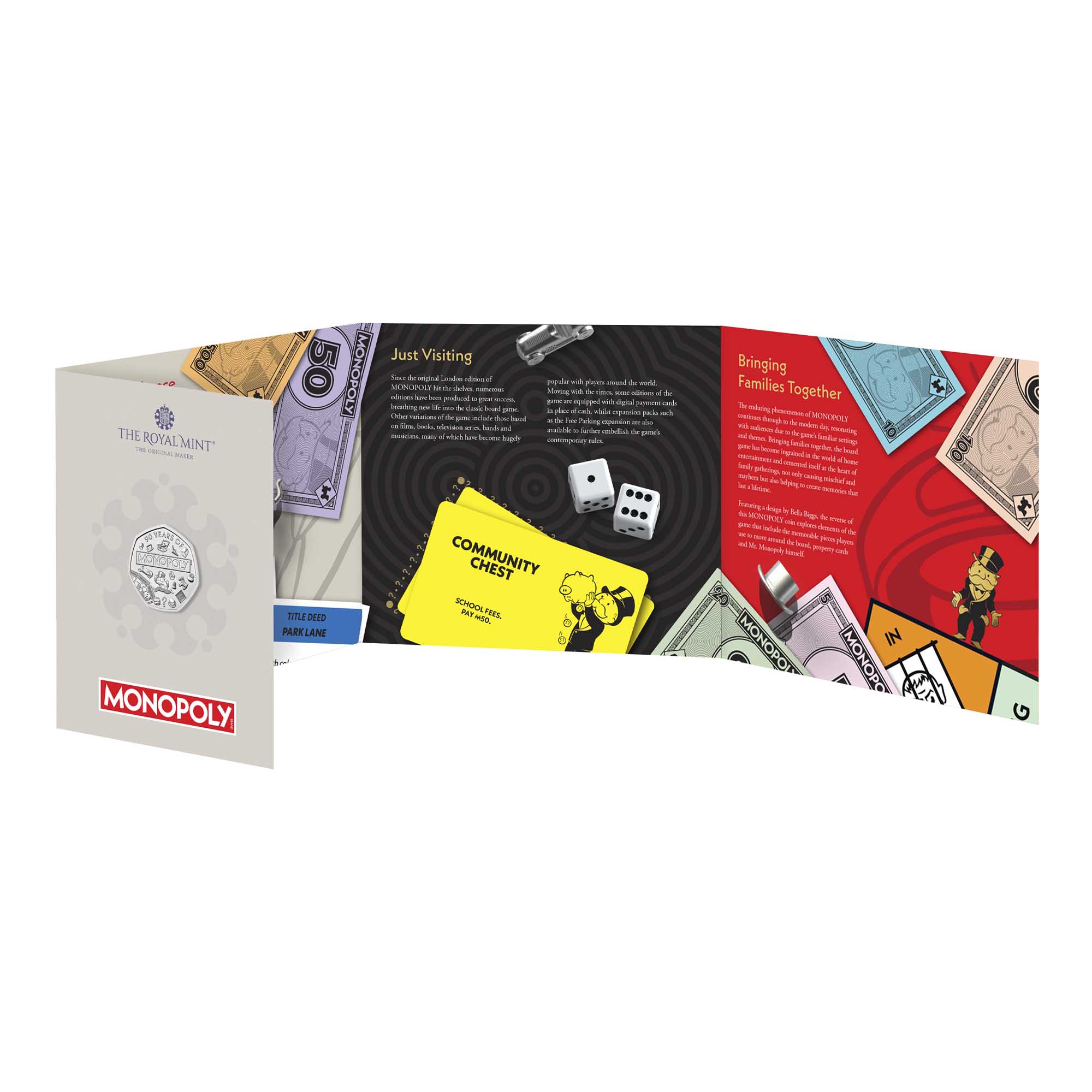 The coin is presented in a beautifully illustrated presentation card that explores the story of Monopoly and its enduring legacy.