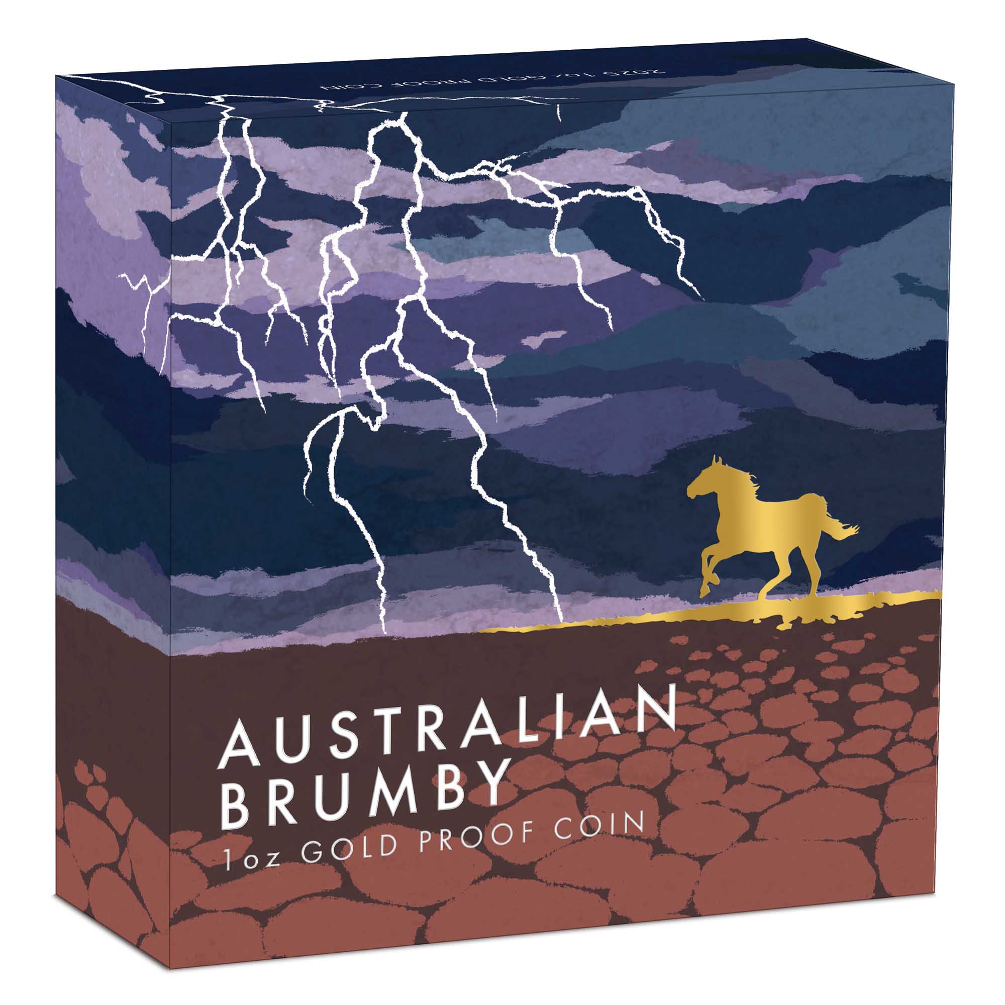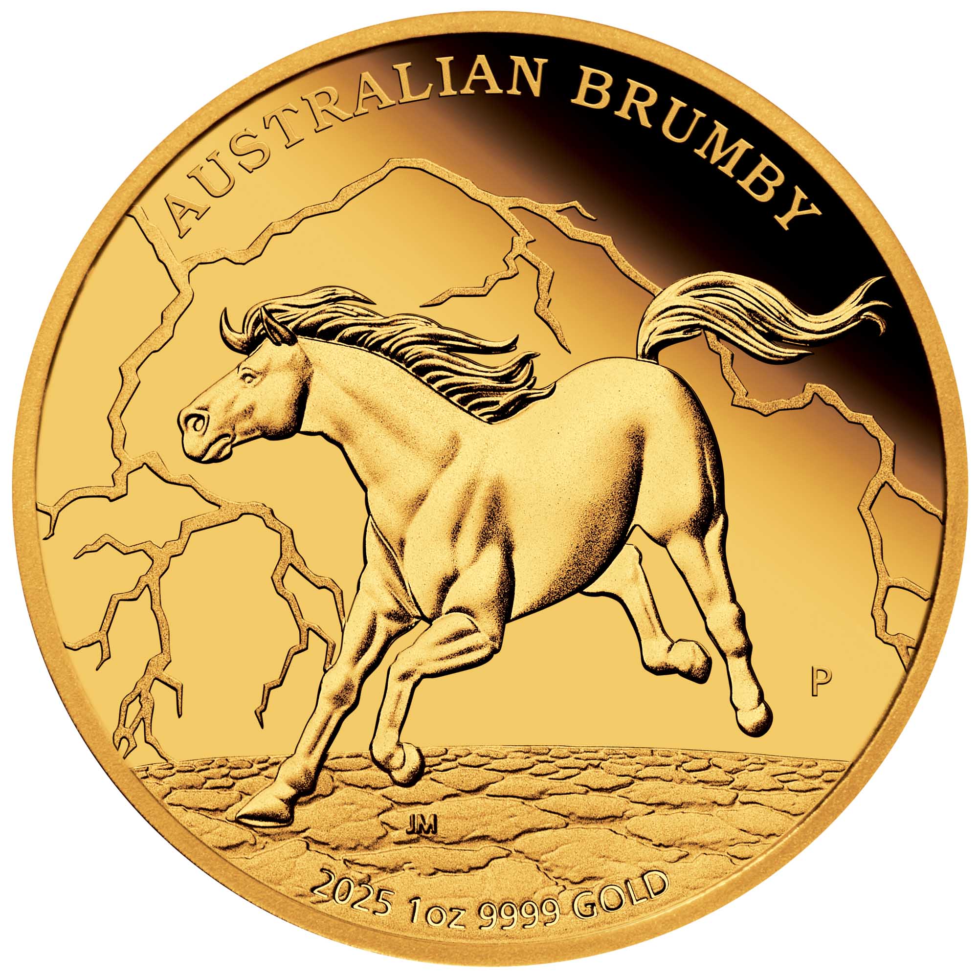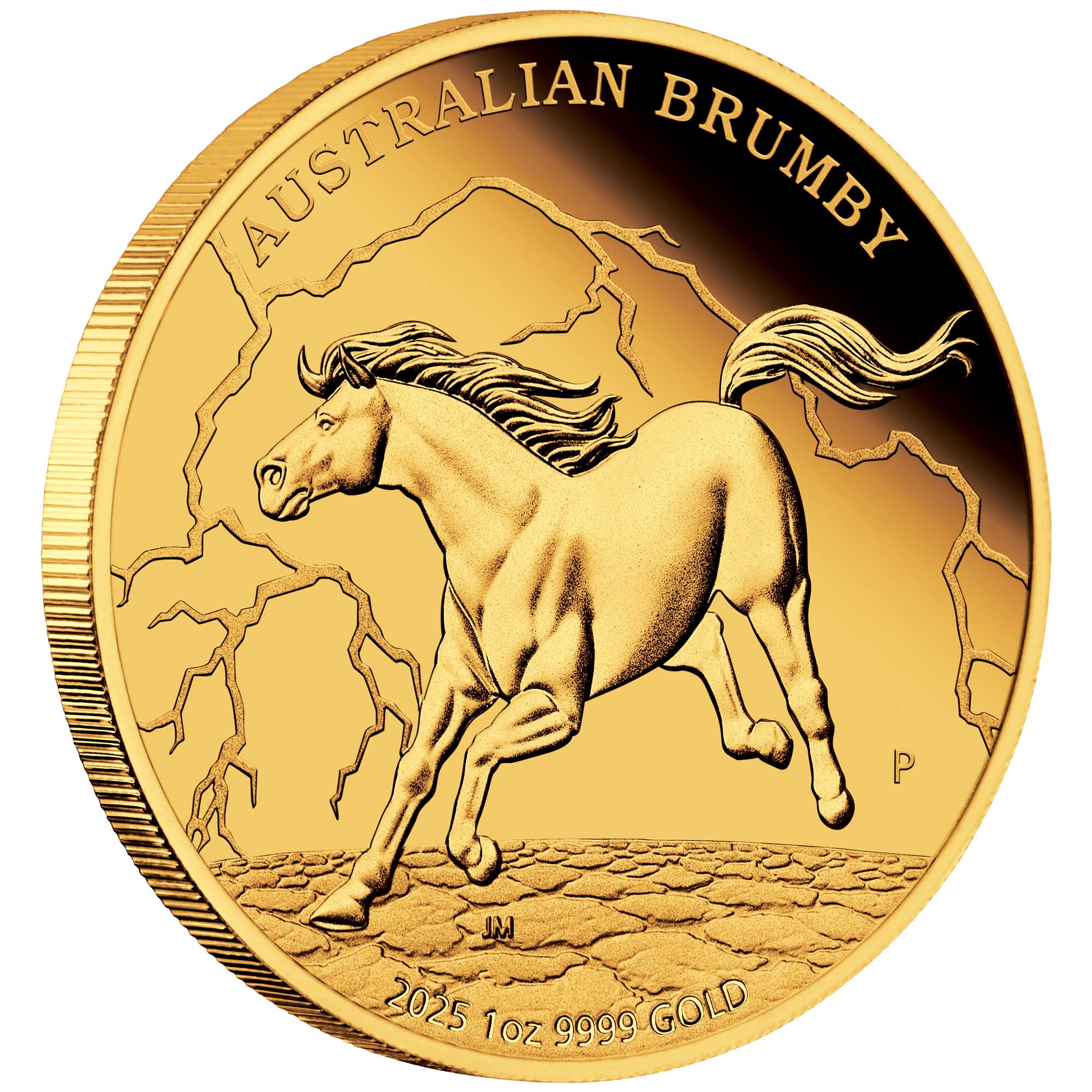 The coin portrays a brumby galloping in an arid, barren landscape with spectacular forked lightning in a foreboding sky. The design includes the inscription ‘AUSTRALIAN BRUMBY’ and The Perth Mint’s ‘P’ mintmark, as well as the coin’s weight, fineness, and 2025 year-date.