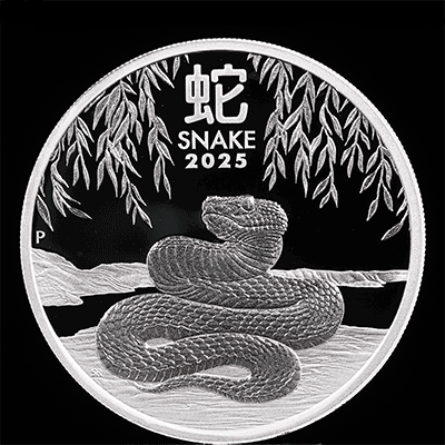 The coin’s reverse portrays a coiled snake on the ground beneath hanging leaves. Included in the design is the Chinese character for ‘snake’, the inscription ‘SNAKE 2025’, and The Perth Mint’s ‘P’ mintmark.
