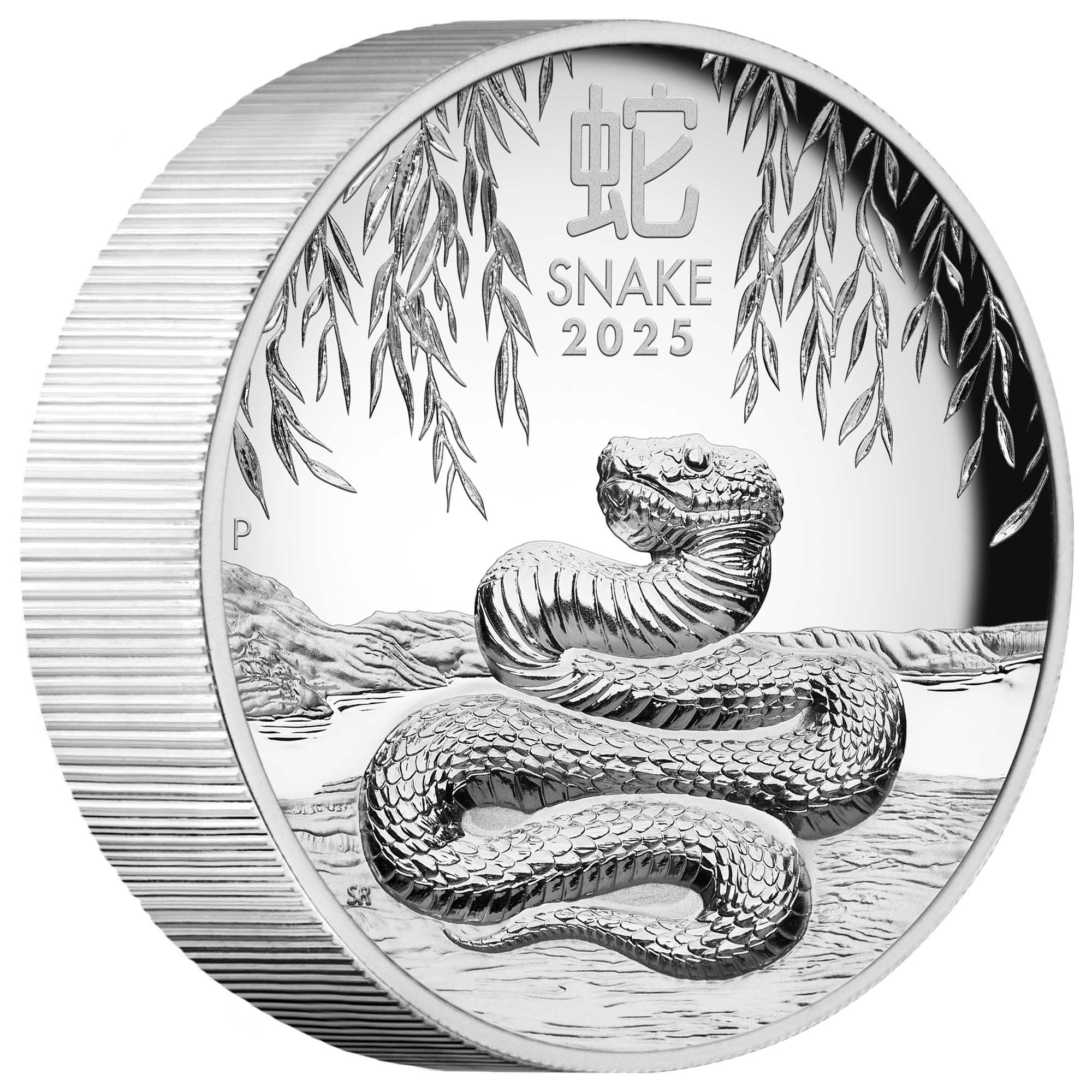 Struck in high relief, the coin’s reverse portrays a coiled snake on the ground beneath hanging leaves. Included in the design is the Chinese character for ‘Snake’, the inscription ‘SNAKE 2025’, and The Perth Mint’s ‘P’ mintmark.