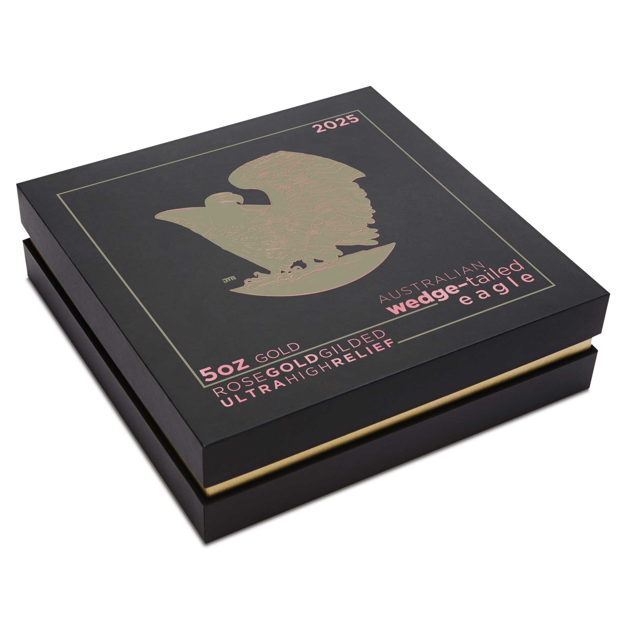 Struck from 5oz of 99.99% pure gold, this exceptional coin showcases Australia’s majestic wedge-tailed eagle in breathtaking ultra high relief, accentuated with exquisite rose gold gilding.