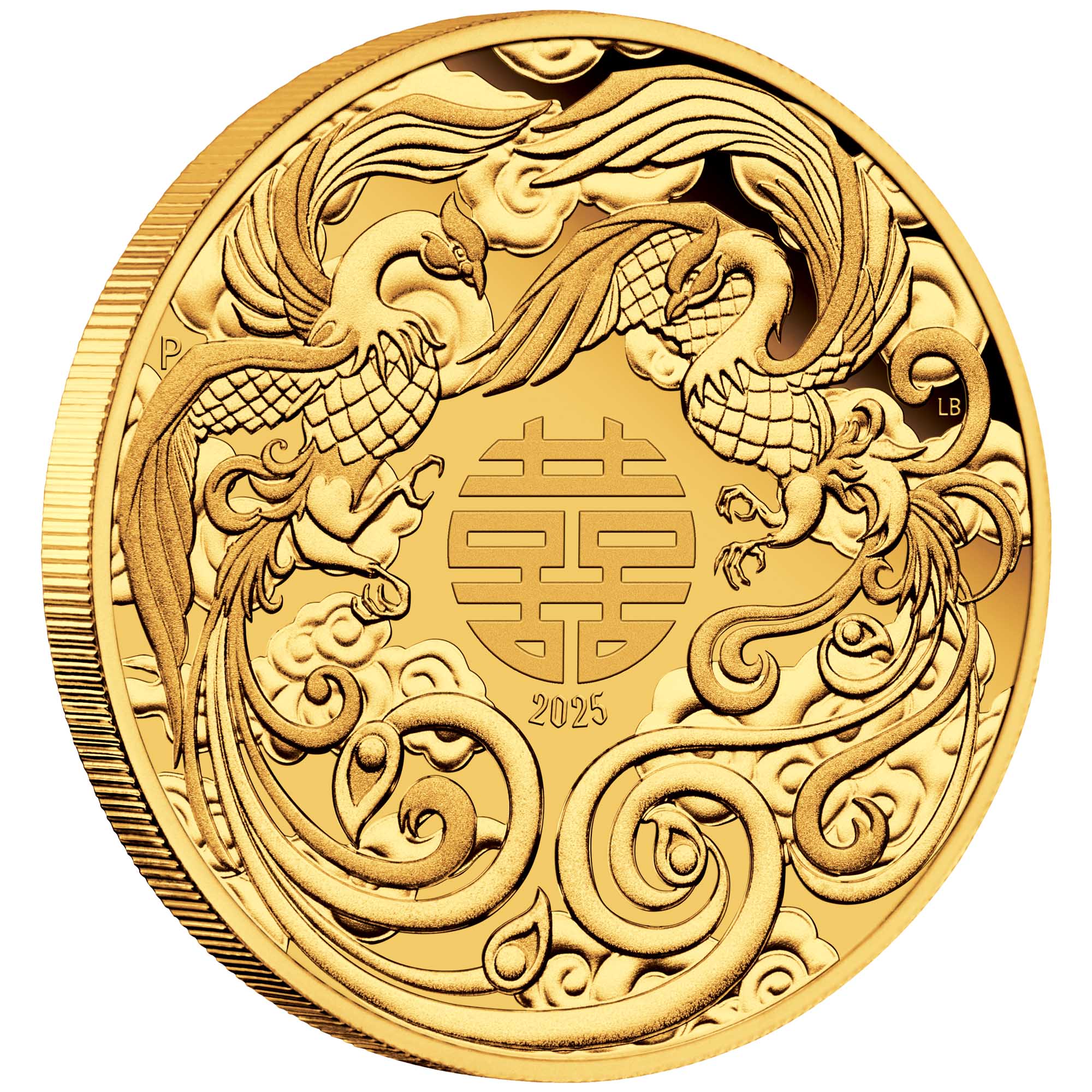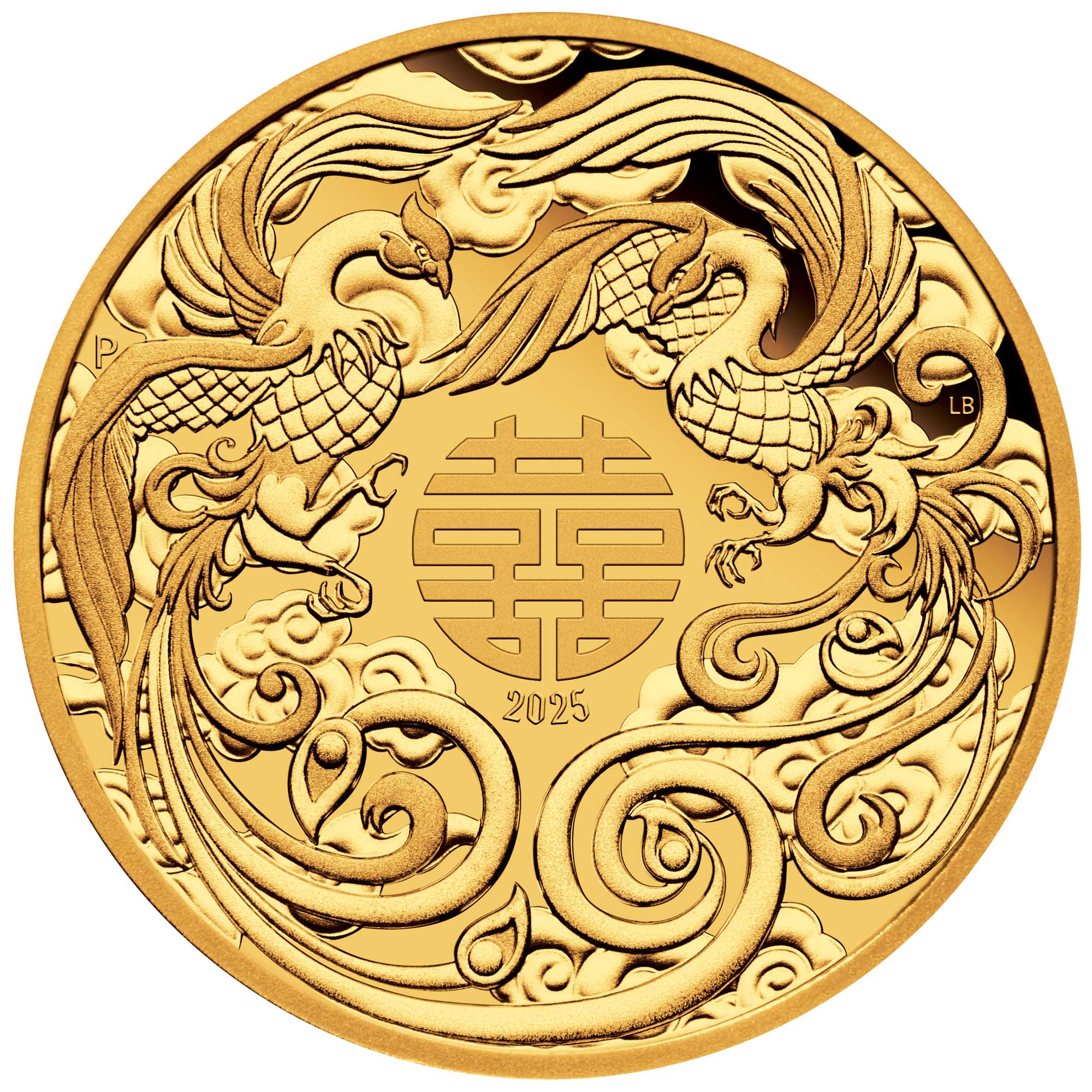 The coin portrays two crested birds gazing at one another with affection. Often referred to as 'Luan and Feng' or 'Phoenix', these figures represent the harmonious love between spouses. Included in the design is the symbol double happiness, stylised representations of clouds, along with the 2025 year-date and The Perth Mint’s ‘P’ mintmark.