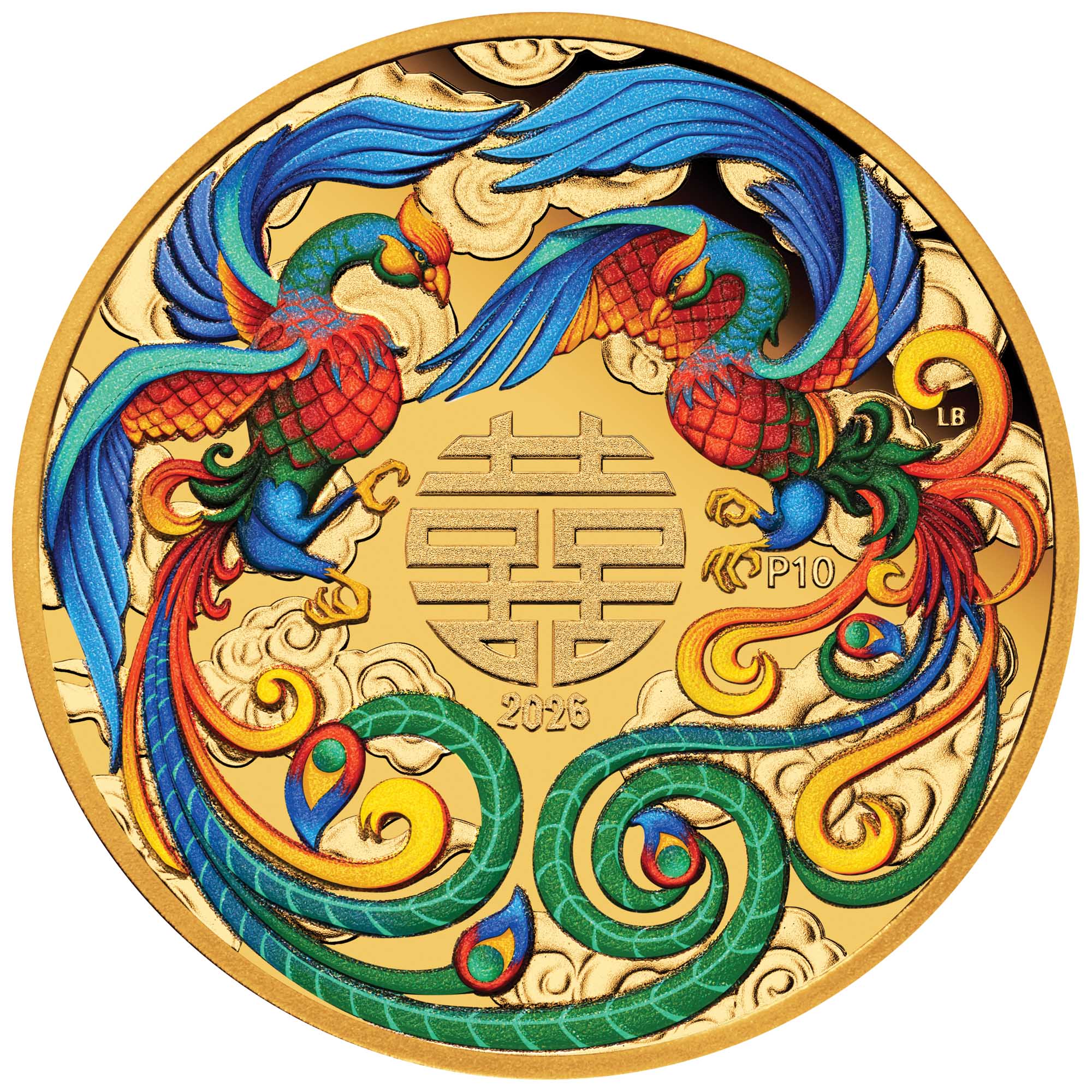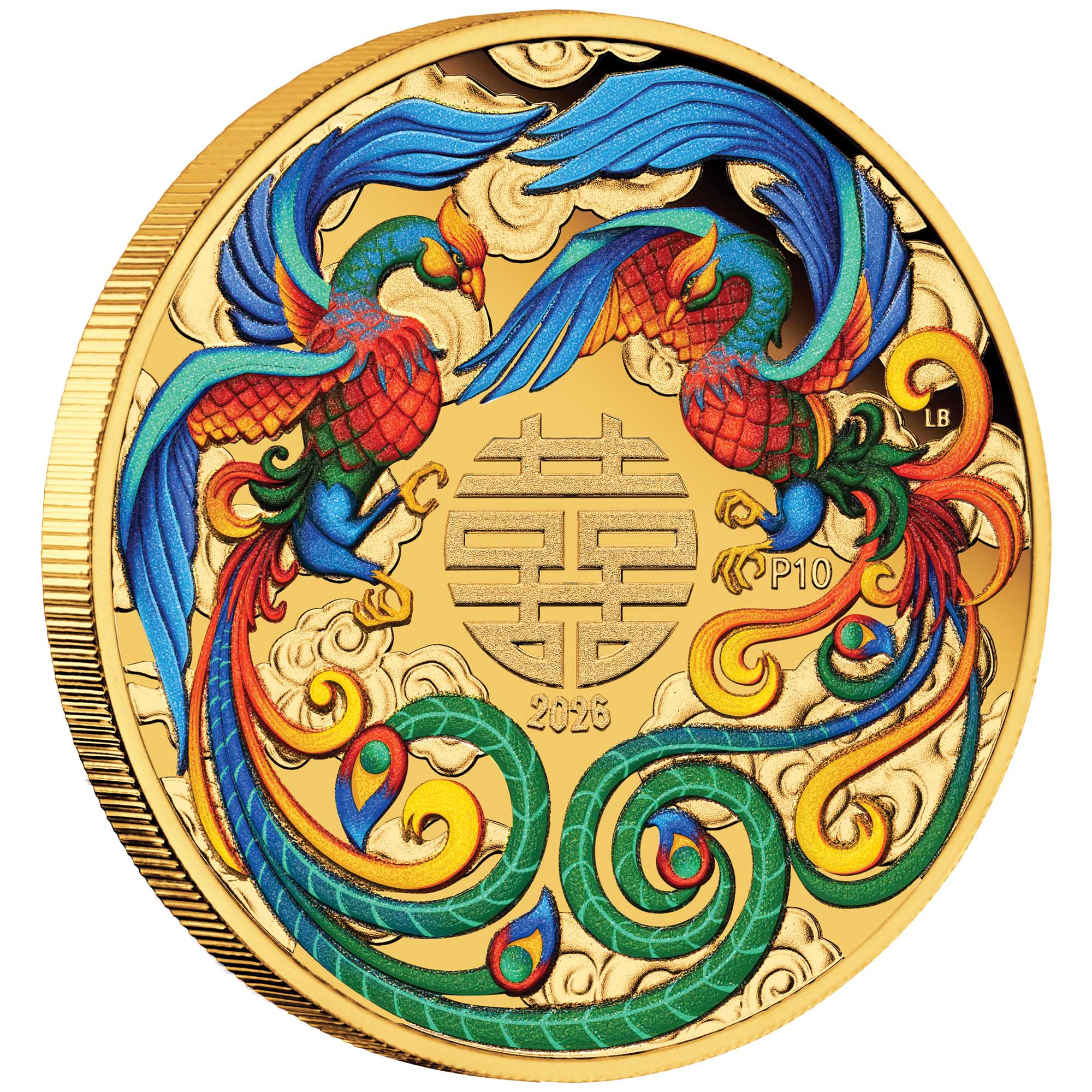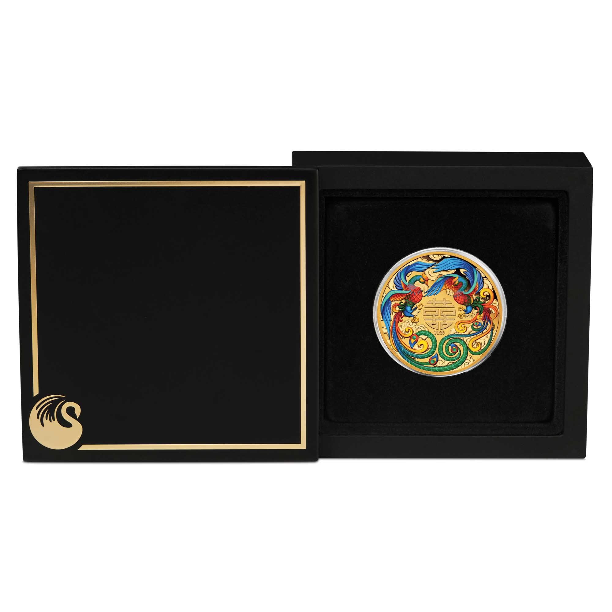 The coin’s coloured reverse portrays two crested birds gazing at one another with affection. Often referred to as 'Luan and Feng' or 'Phoenix', these figures represent the harmonious love between spouses. Included in the design is the symbol double happiness, stylised representations of clouds, along with the 2026 year-date and The Perth Mint’s ‘P’ mintmark.