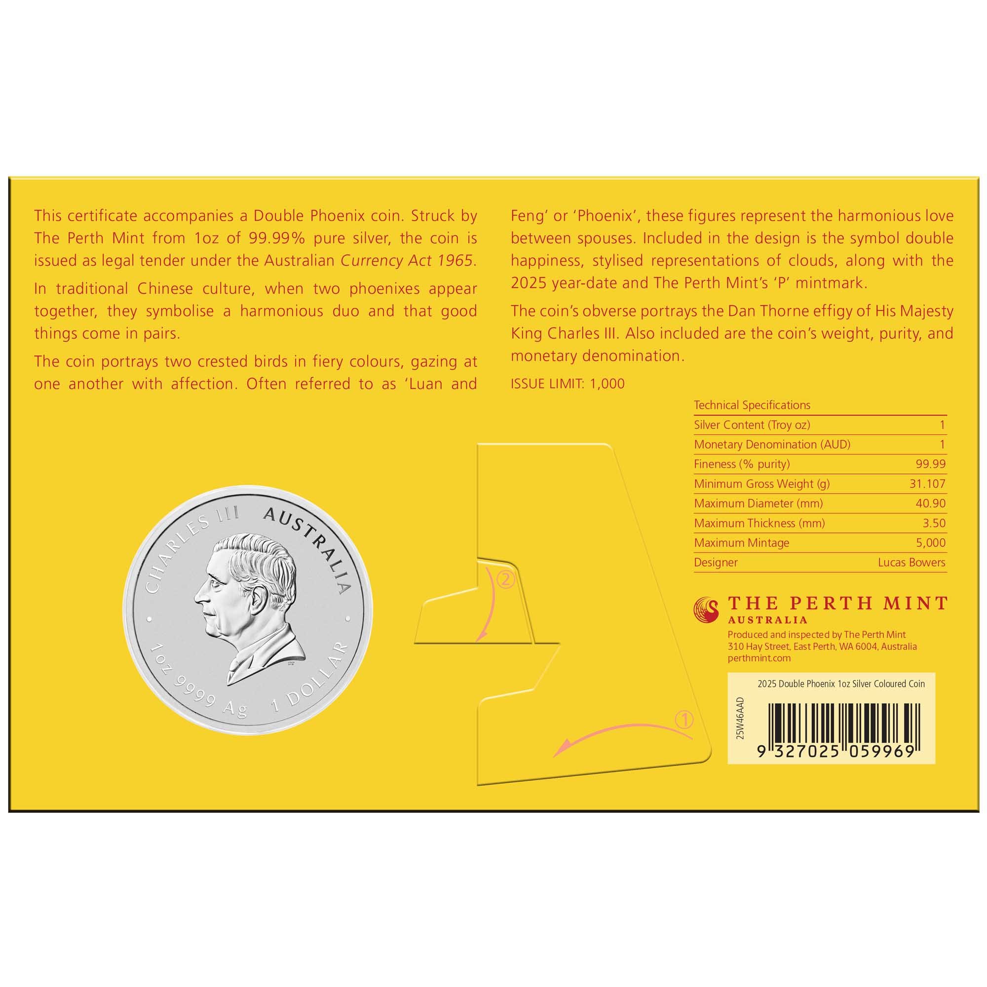 Struck from 1oz of 99.99% pure silver, this splendid coin embodies the double phoenix – a cherished Chinese symbol, signifying prosperity in pairs.
