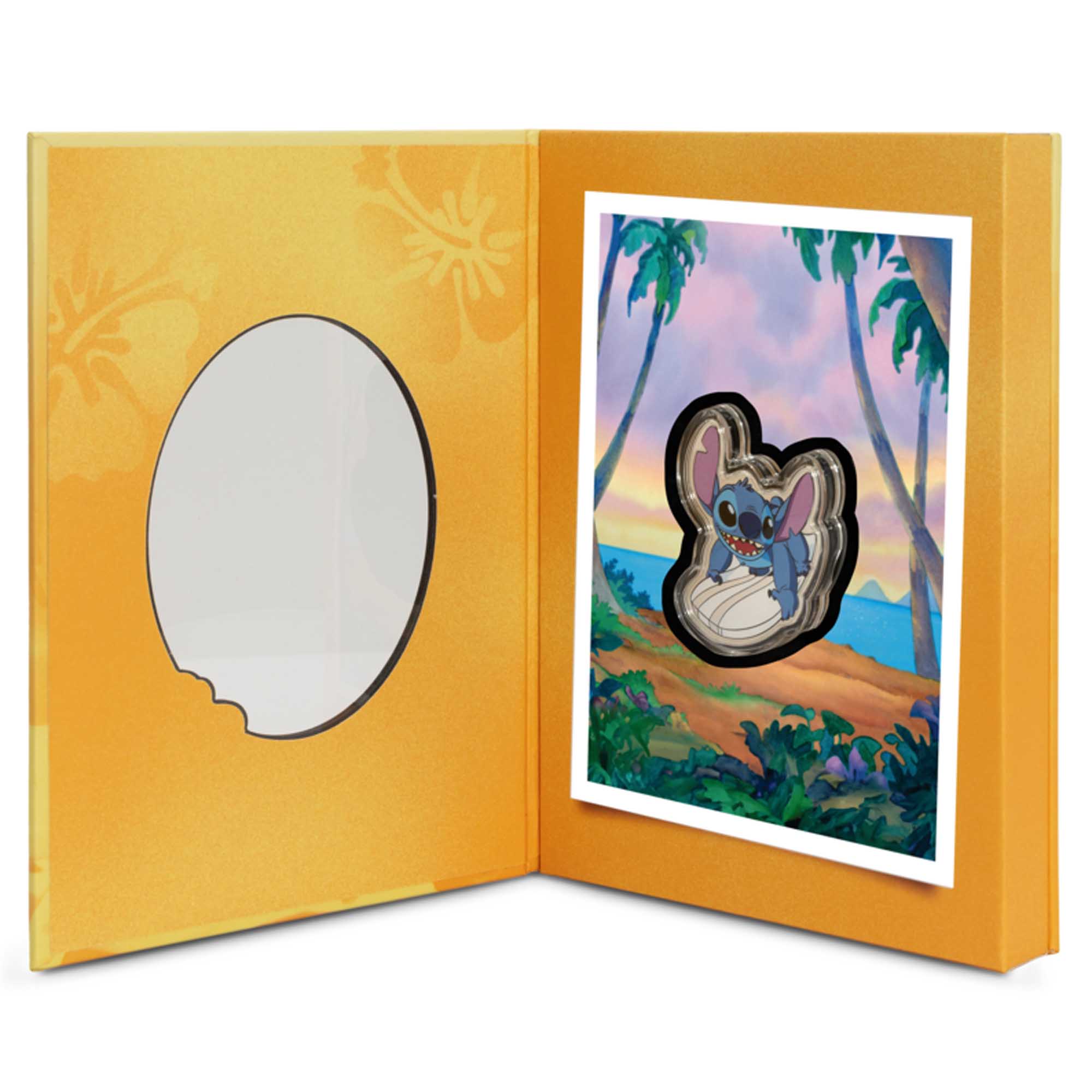Carefully minted from 1oz of 99.9% pure silver, this officially licensed collectable brings Disney’s Stitch to life in stunning colour, capturing his energetic spirit as he surfs with pure excitement. The two stripes on his board have been left engraved, and shine in mirror-finish; a frosted rim completes the design.