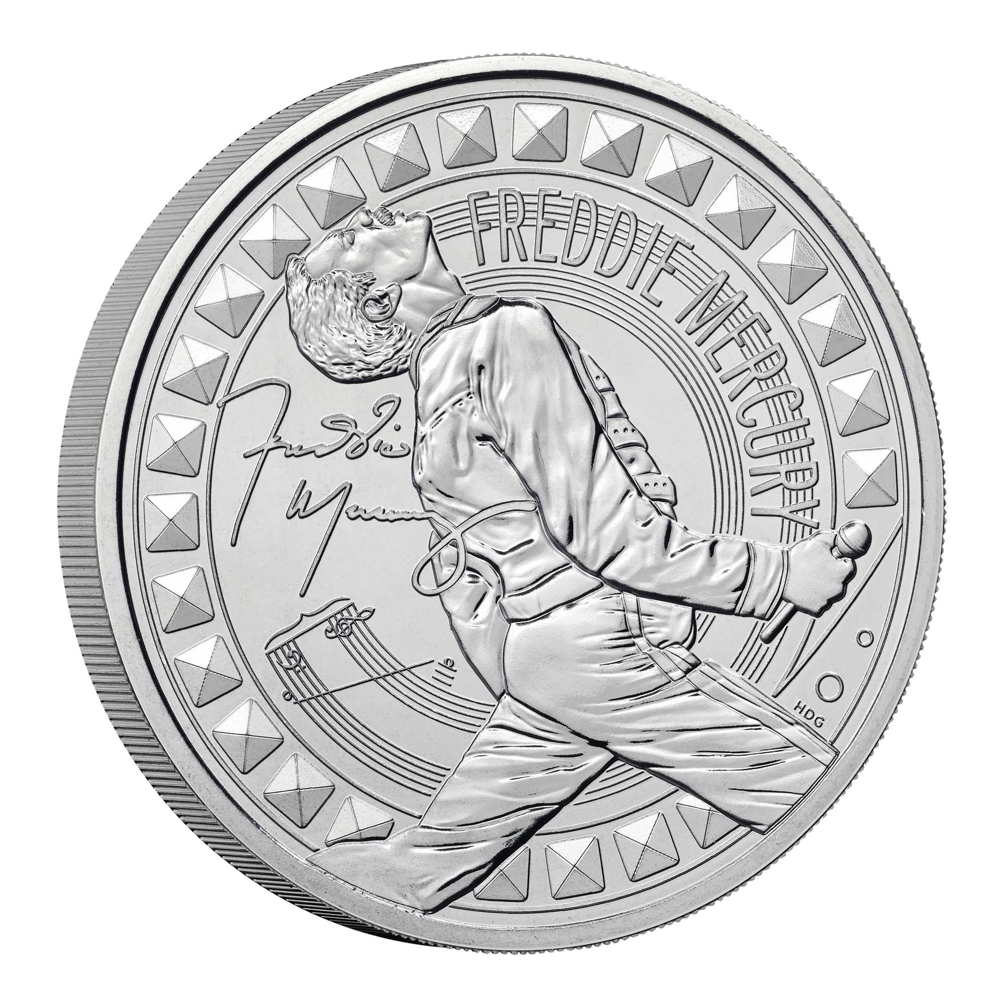 Struck in base metal to brilliant uncirculated quality, this coin offers an affordable way for fans and collectors to own a piece of numismatic history. The reverse design showcases Freddie Mercury in full performance energy, inspired by his legendary Live Aid 1985 appearance. A musical stave encircles the coin’s edge, symbolising Mercury’s extraordinary four‑octave vocal range, while his signature completes the design. The obverse features the official effigy of King Charles III, connecting this modern collectable to Britain’s living monarchy.