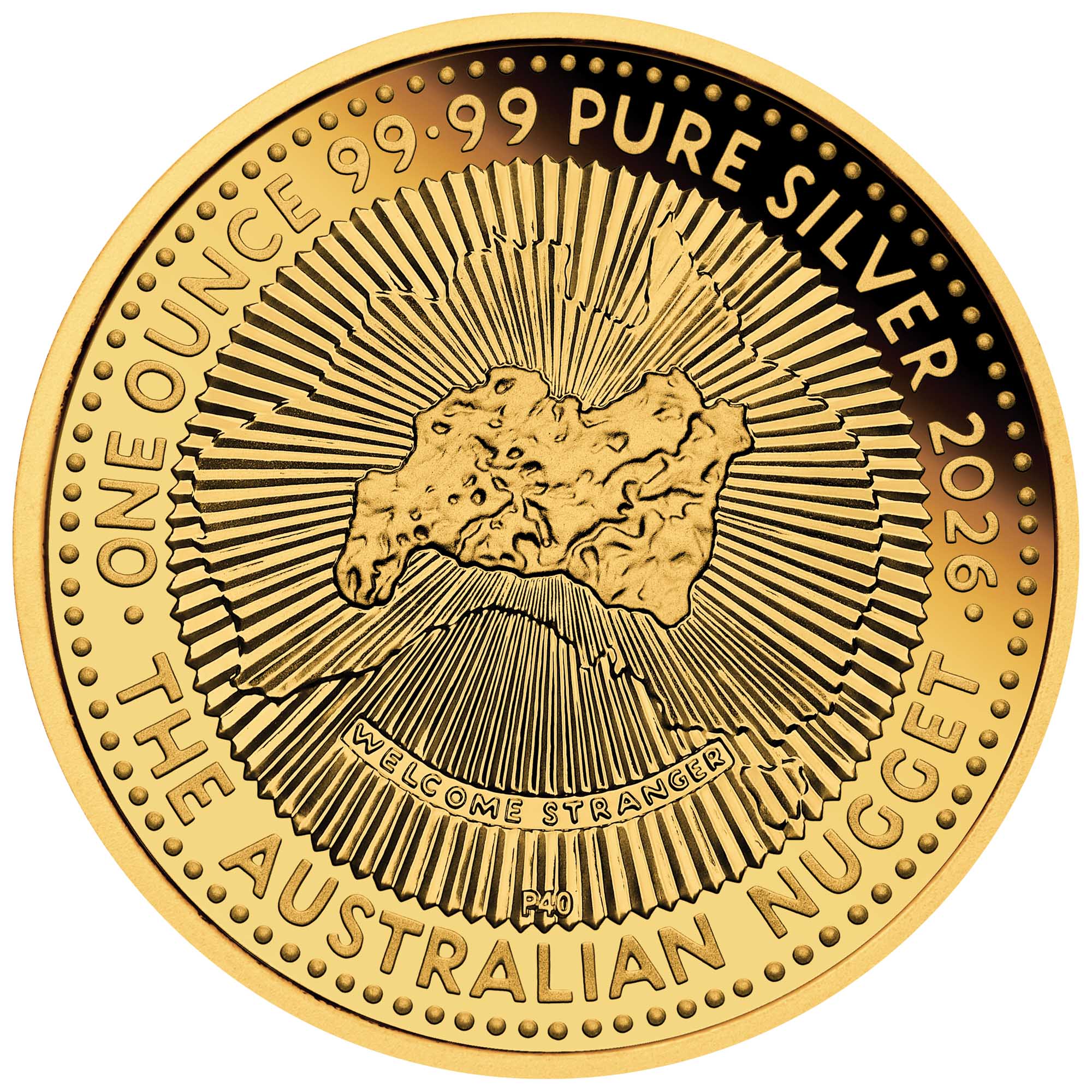 The portrayal of the nugget and the outer rim are gilded in 24-carat gold. The nugget is surrounded by a line drawing of the map of Australia and encircled by a ring of stylised sun rays. Within the design is the nugget’s name, and a ‘P40’ mintmark. Also included on the reverse is the inscription ‘THE AUSTRALIAN NUGGET’, together with the weight, purity and 2026 year-date.