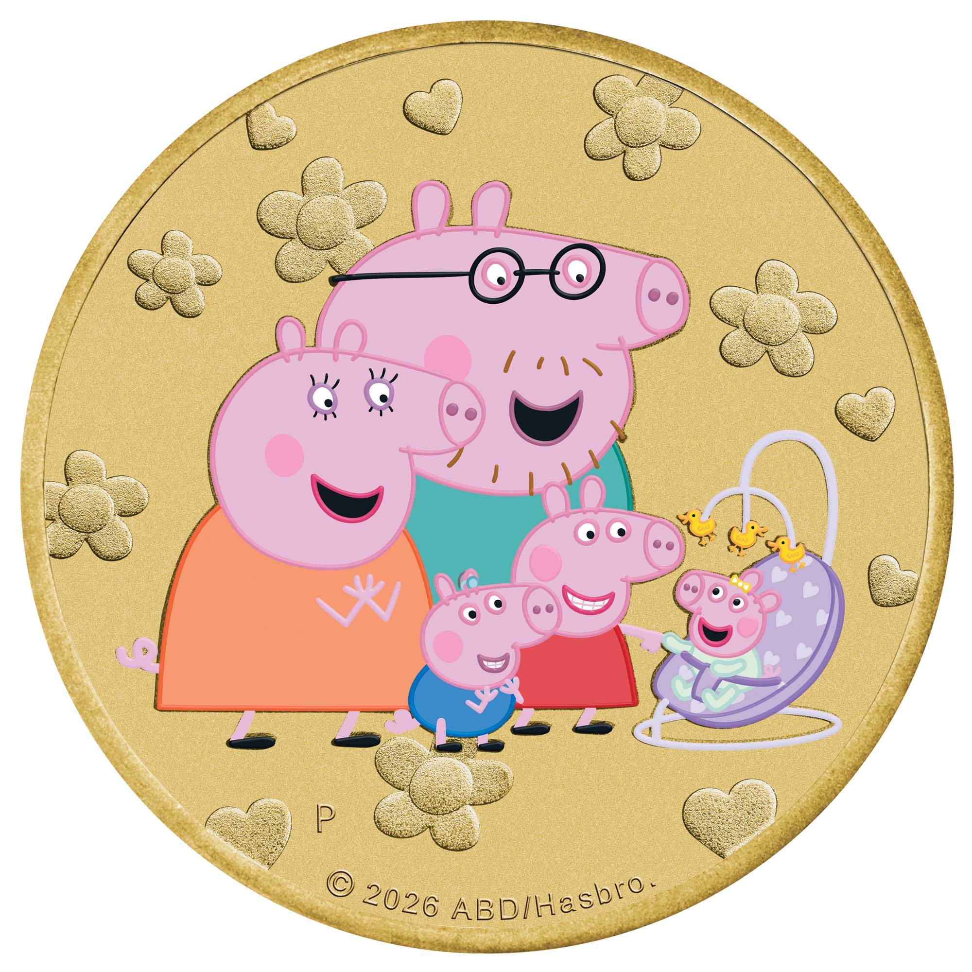 The coin’s coloured reverse portrays a heartwarming family portrait of Peppa, Mummy Pig, Daddy Pig and George, all gazing lovingly at baby Evie in her rocker. Included in the design are floral motifs in the background and The Perth Mint’s ‘P’ mintmark.