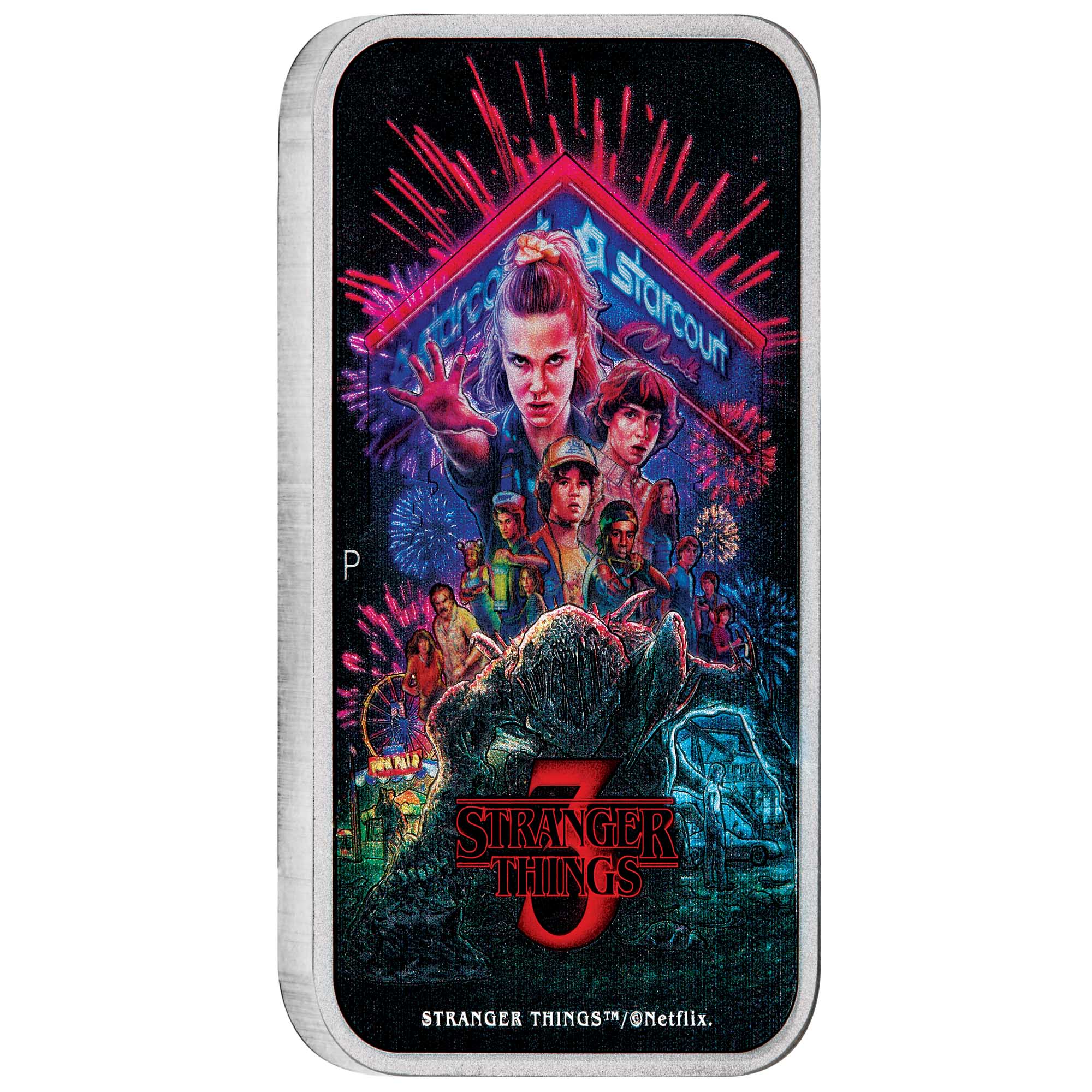 Struck from 1oz of 99.99% pure silver, this rectangular coin celebrates the iconic Season 3 poster of Stranger Things—a standout collectable for devoted fans of the hit series.