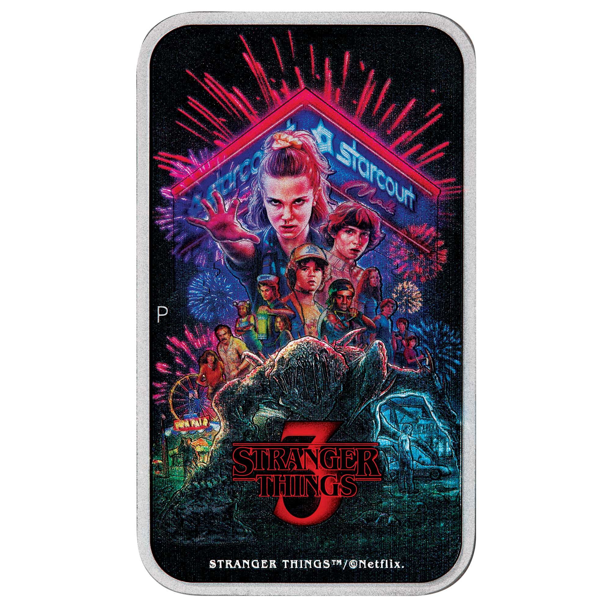 The coin’s coloured reverse pays tribute to the iconic Season 3 poster. The design features the main characters—Mike, Dustin, Lucas, Eleven, and the rest of the Hawkins crew—united in a dramatic scene illuminated by bursting fireworks, carnival rides and the glowing sign of the Starcourt Mall. Looming in the foreground is the menacing presence of the Mind Flayer. The design includes the Stranger Things Iogo along with The Perth Mint’s ‘P’ mintmark.