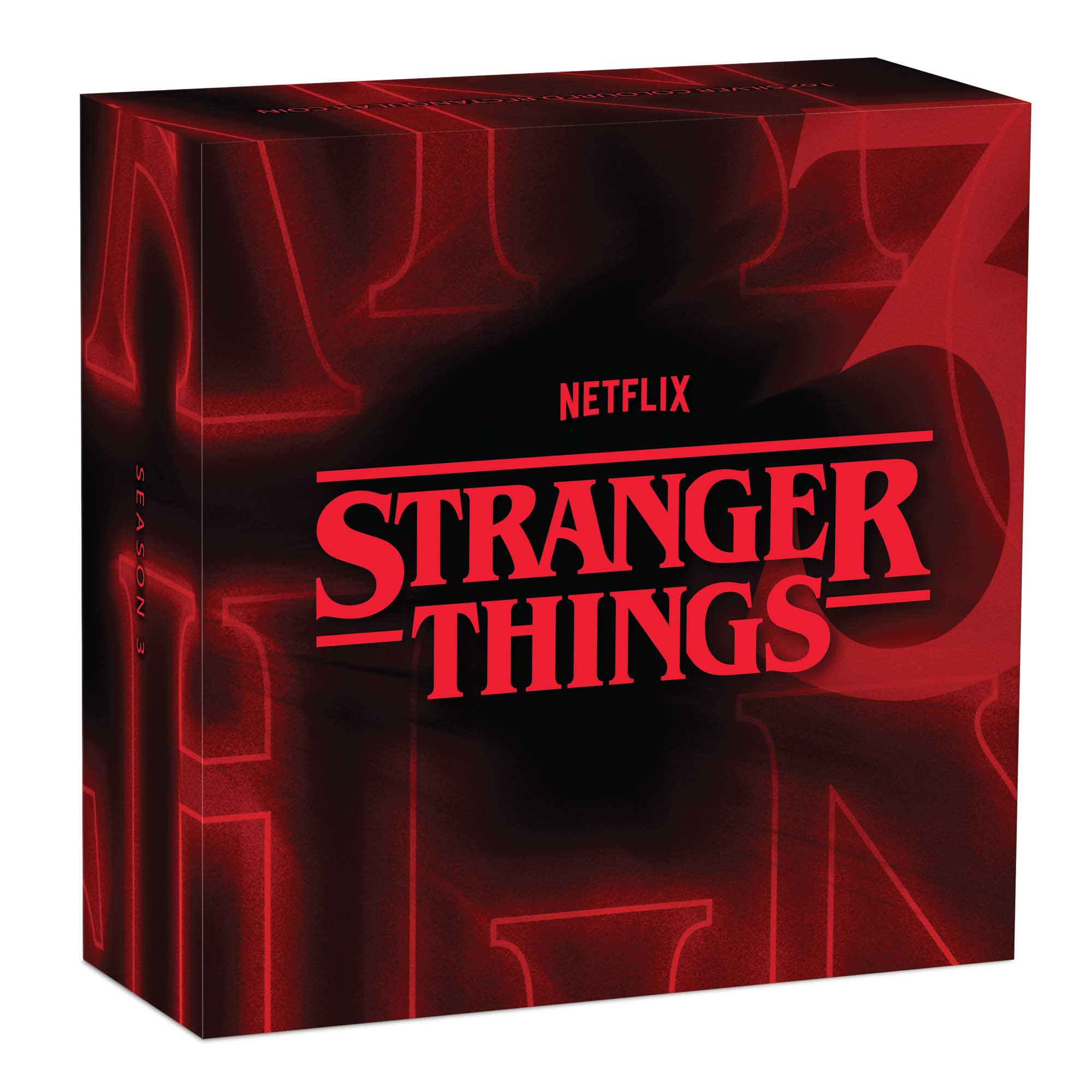 The coin is housed in a black wooden case with red accents. The lid of the case features embossed details, as well as the official Netflix and Stranger Things logos. Packaged in a themed shipper, the release is accompanied by a numbered certificate of authenticity.