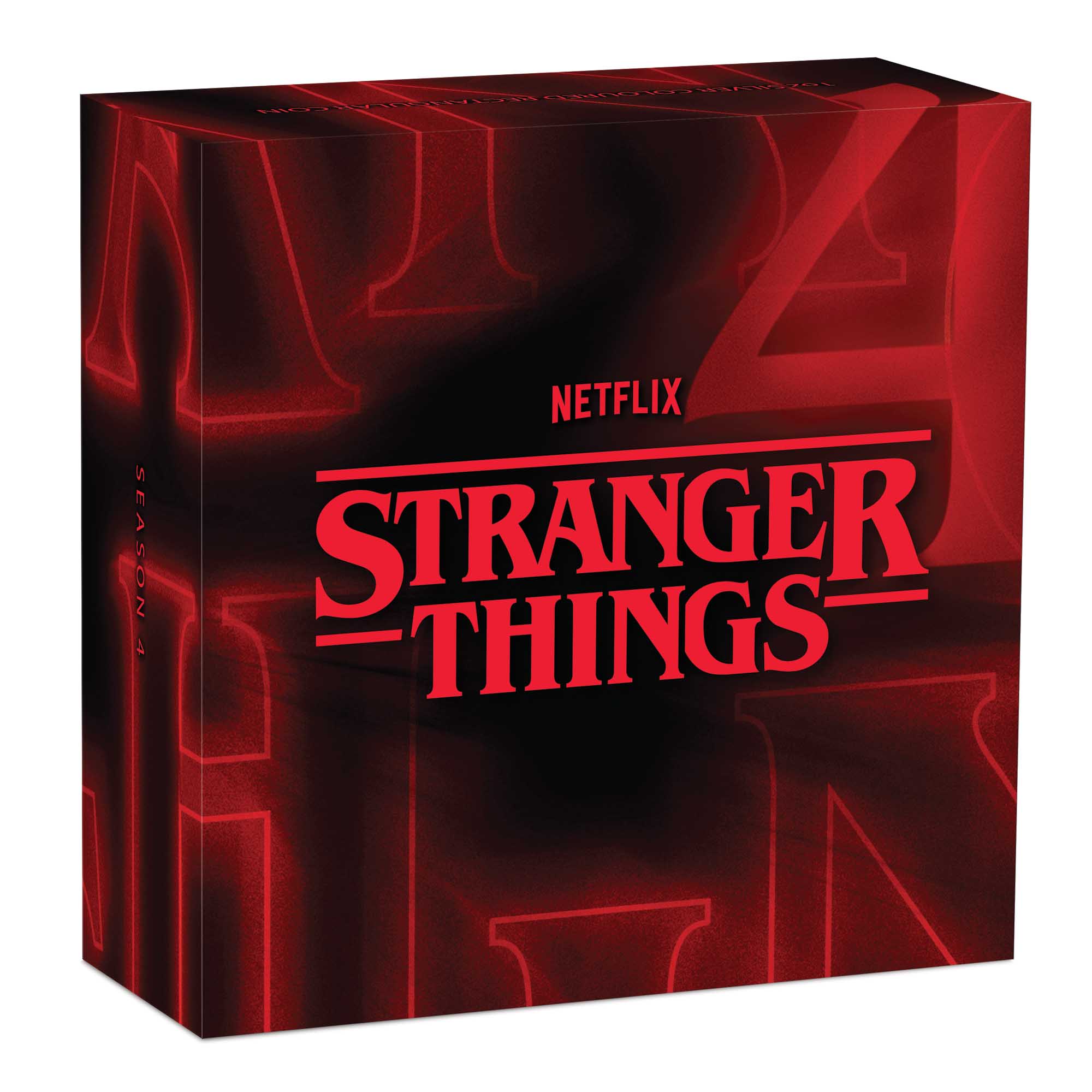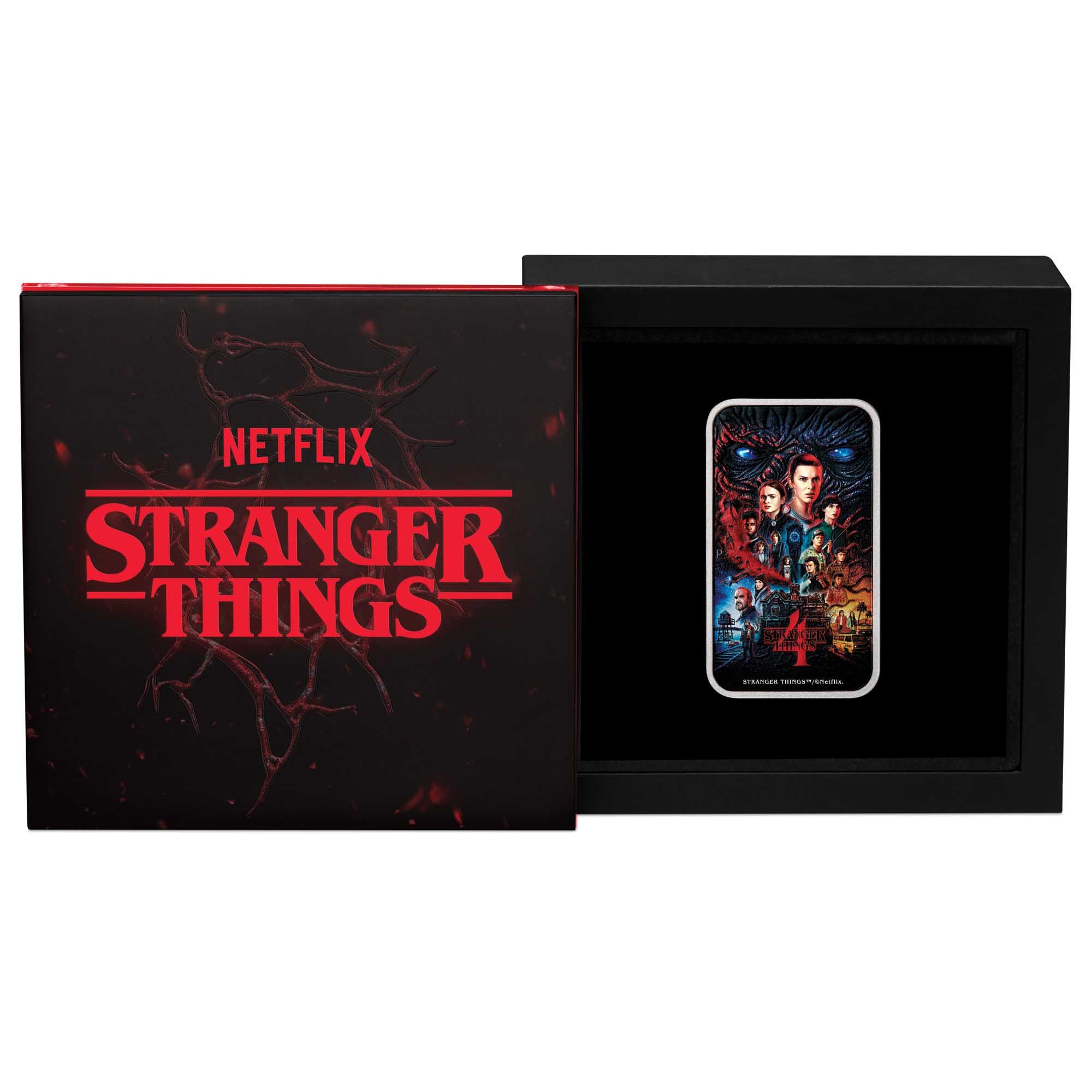 The coin is housed in a black wooden case with red accents. The lid of the case features embossed details, as well as the official Netflix and Stranger Things logos. Packaged in a themed shipper, the release is accompanied by a numbered certificate of authenticity.