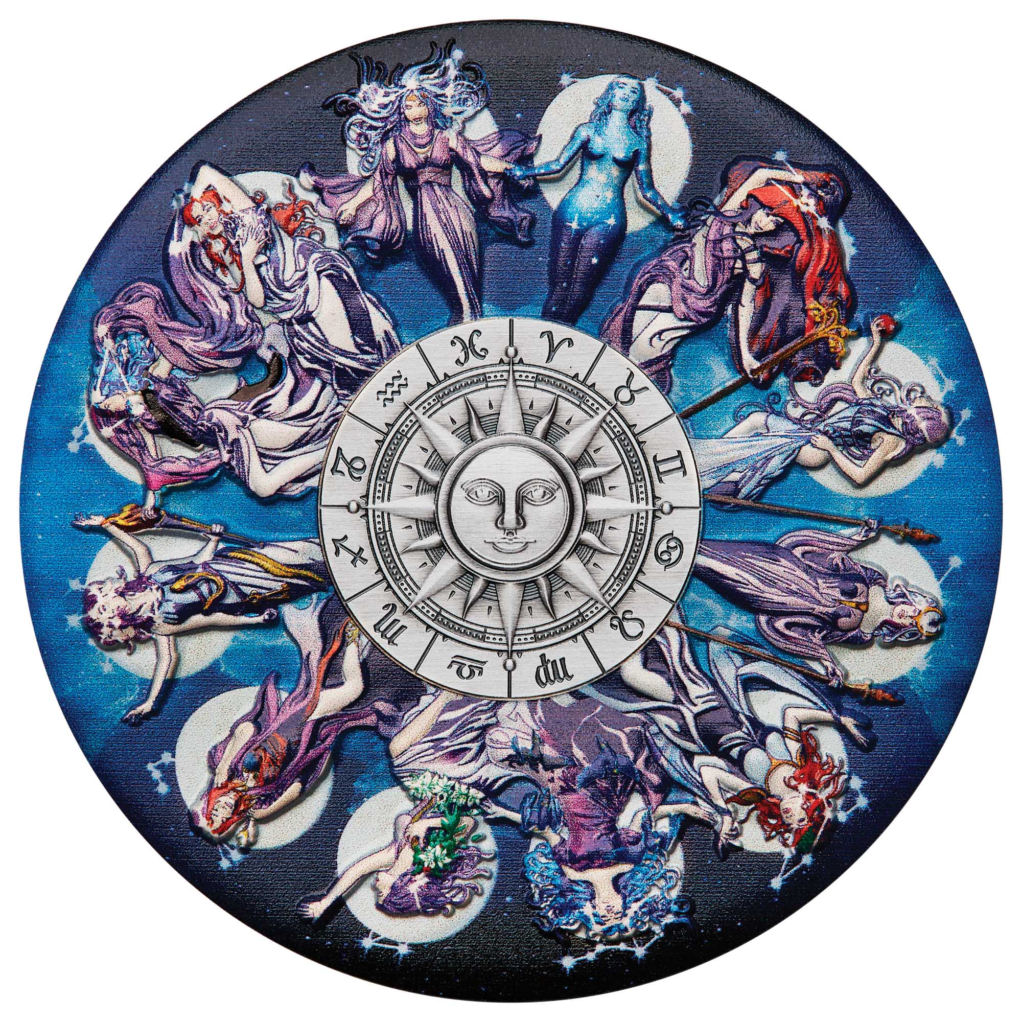 The coin’s reverse features a centrepiece symbolising the sun, perfectly encased by a ring segmented into 12 unique zodiac symbols. Each astrological sign's accompanying goddess is illustrated in colour against a backdrop of an enchanting blue sky.