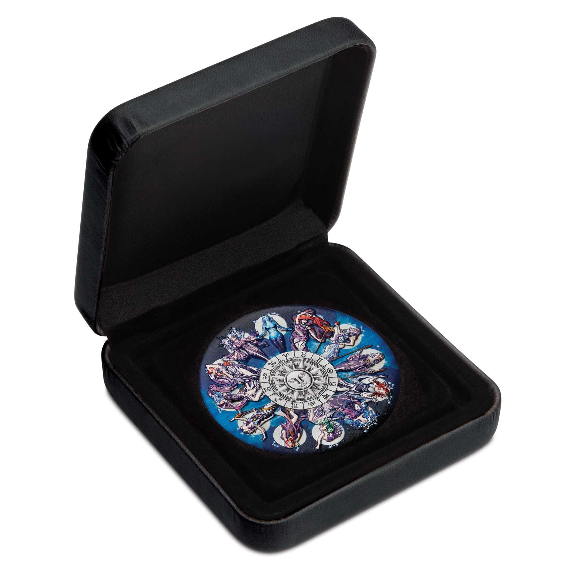 Crafted from 5oz of 99.99% pure silver, this antiqued coloured coin features the distinctive characteristics and vibrant energies of the 12 zodiac signs, each represented by their associated celestial goddesses.