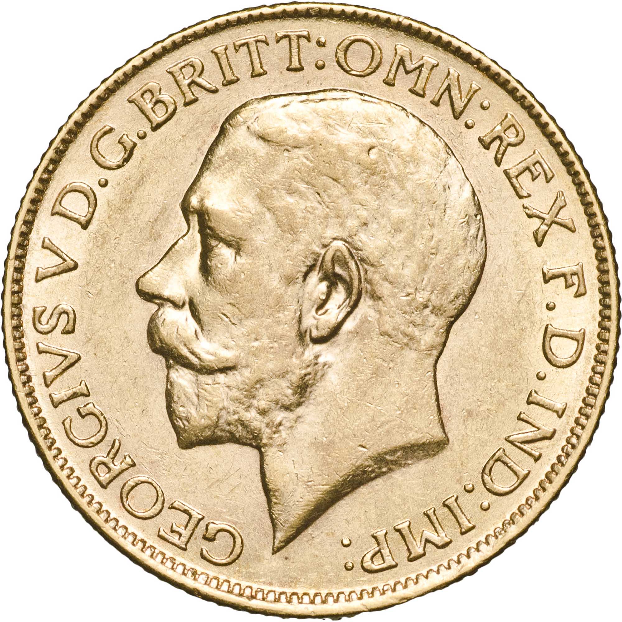 The coin features a large, uncrowned bust of King George V facing left on its obverse, the portrait was designed by Edgar Bertram Mackennal, an Australian born in Melbourne 1863. The inscription reads 'GEORGIVS V D.G.BRITT: OMN: REX F.D.IND:IMP:' meaning 'George V, by the Grace of God, King of all the Britains, Defender of the Faith, Emperor of India'—a title held by British monarchs from Queen Victoria in 1876 until 1947.