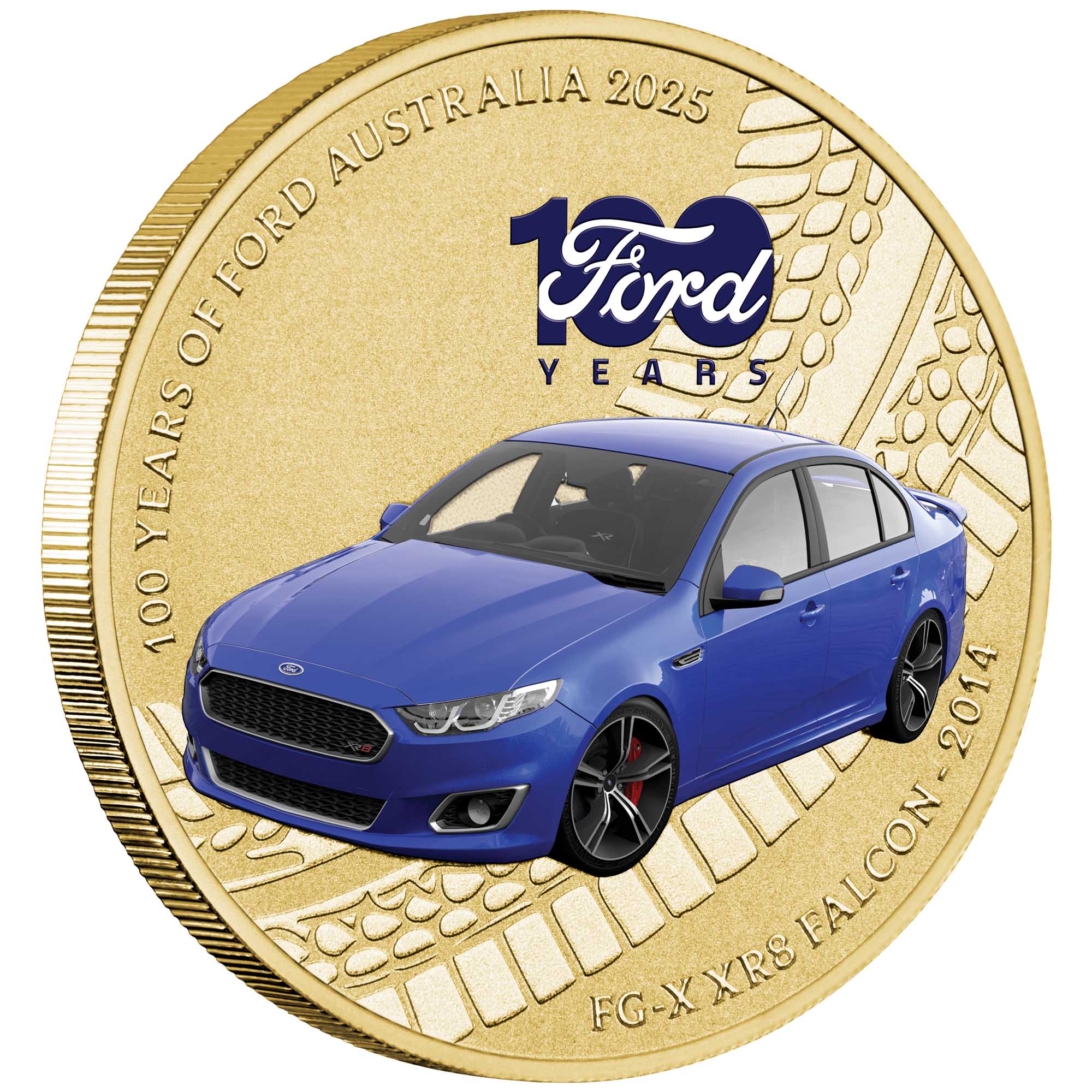 The coin’s reverse features a coloured image of a Ford FG-X XR8 Falcon, set against a background of a tyre pattern. Included in the design is the Ford 100 Years logo and the inscriptions '100 YEARS OF FORD AUSTRALIA 2025' and ‘FG-X XR8 FALCON - 2014’.