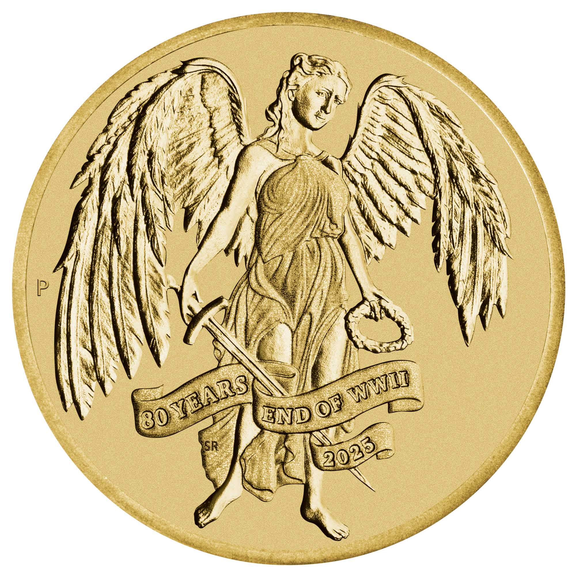The coin presents a powerful portrayal of Nike as Winged Victory. Her muscular figure, symbolising strength, stands with ethereal, feathered wings spread out in full glory. She clutches a sword in her right hand, as a gesture of respect, and a palm wreath in her left, signifying her role as the messenger of victory. As well as the inscription '80 YEARS END OF WWII 2025', the reverse also incorporates The Perth Mint’s ‘P’ mintmark.