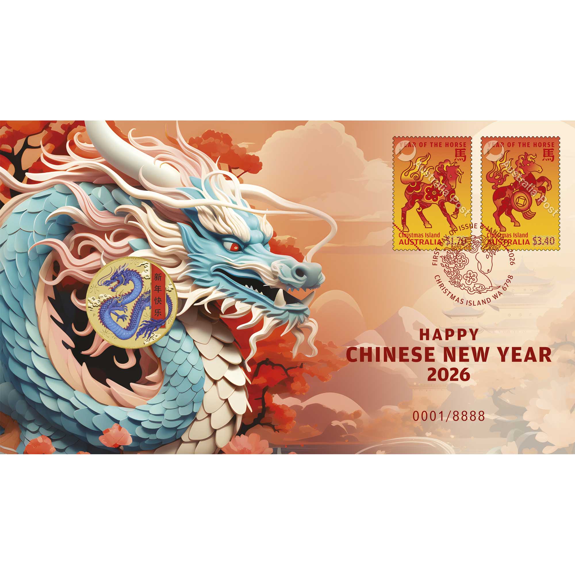The coin is housed in an illustrated presentation envelope featuring a blue and white-coloured dragon set against a red and orange landscape of sky, trees, mountains and pagodas. Also featured are the words 'HAPPY CHINESE NEW YEAR 2026'.