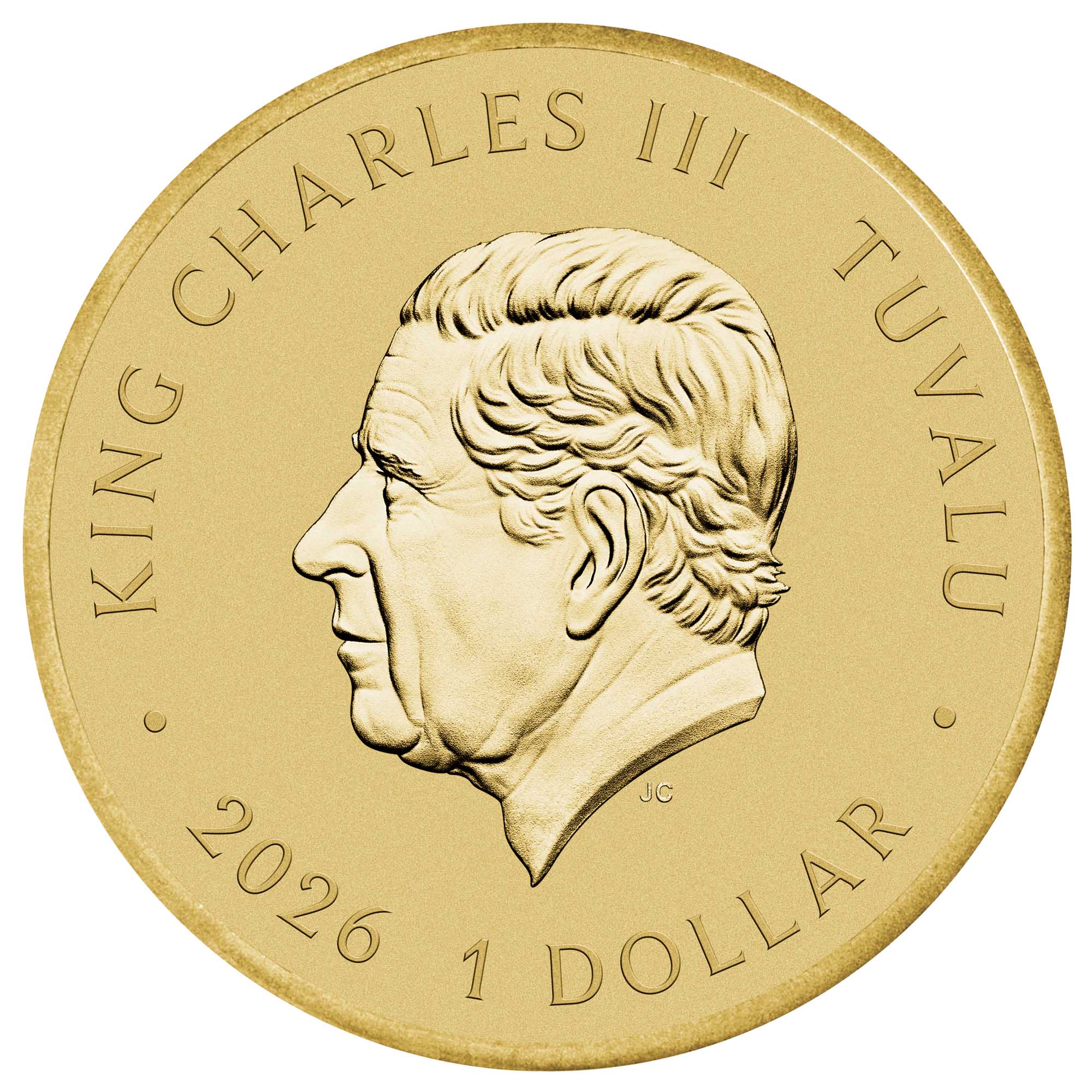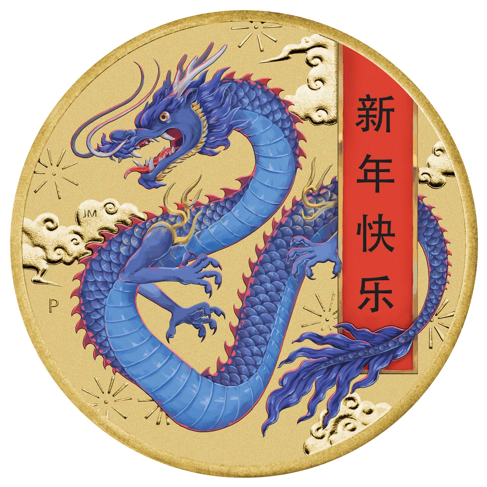 The coin’s coloured reverse presents an illustration of a blue dragon with red spikes dancing among celestial clouds. As well as a red Chinese scroll with Chinese characters “新年快乐”, meaning 'Happy New Year', the reverse also incorporates The Perth Mint’s ‘P’ mintmark. The obverse bears the Jody Clarke effigy of His Majesty King Charles III and monetary denomination.