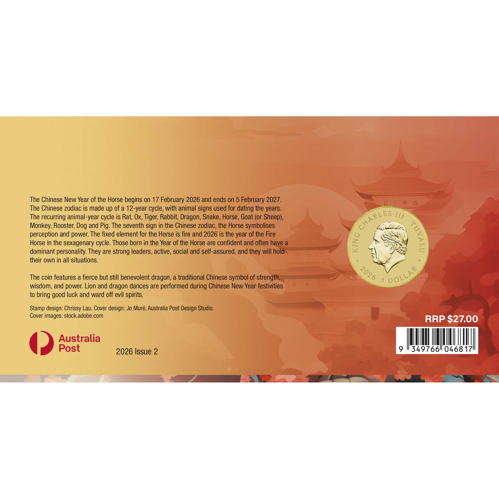 The official $1.70 Australia Post stamp features a red and gold-coloured horse decorated with floral motifs and a flame-like mane and tail. A red and gold-coloured horse is also depicted on the $3.40 stamp beside it, decorated with cloud motifs and donning a lantern. The official postmark comprises an illustration of a horse's bust adorned with flames and flowers encircled by the words 'FIRST DAY OF ISSUE 6 JANUARY 2026 CHRISTMAS ISLAND WA 6798'.