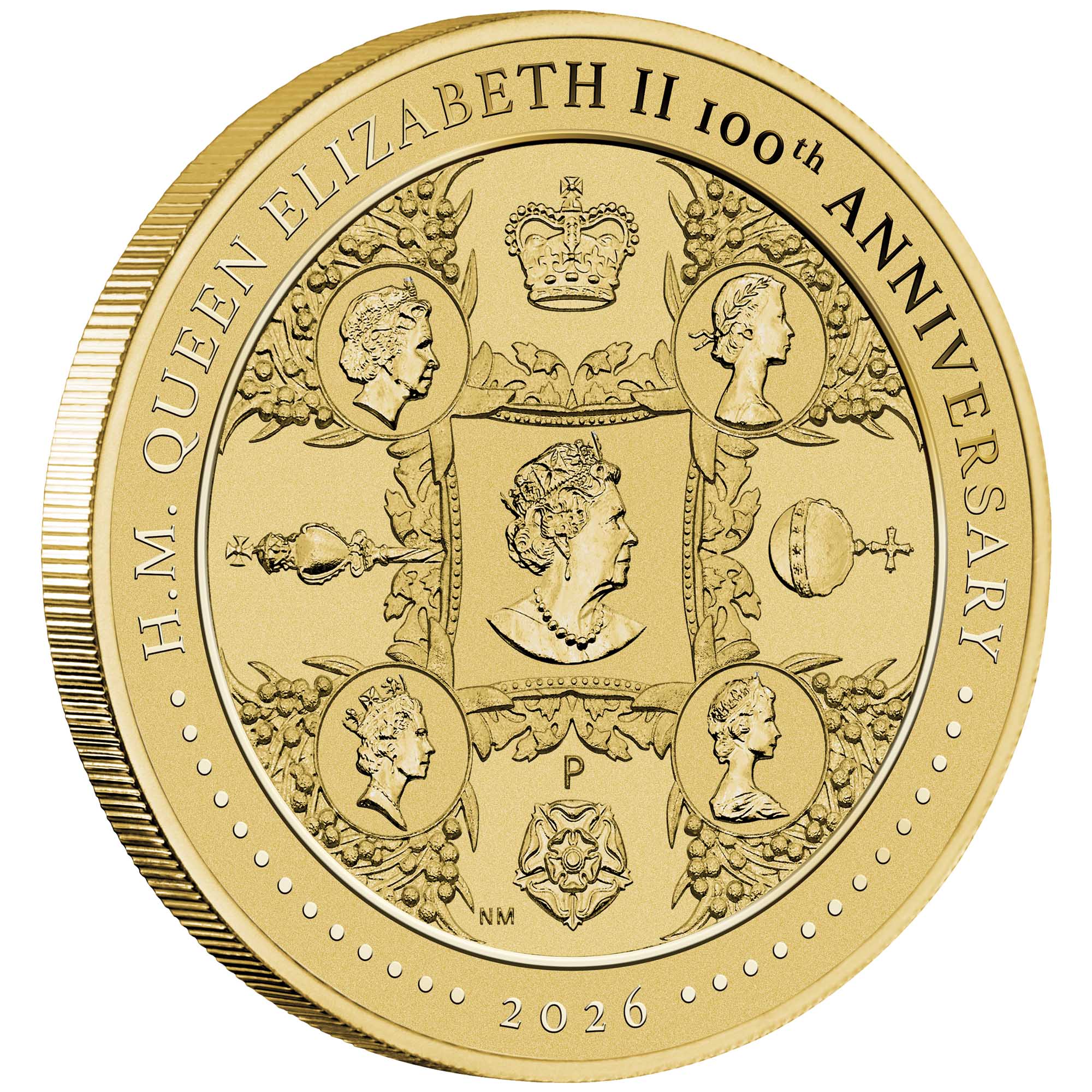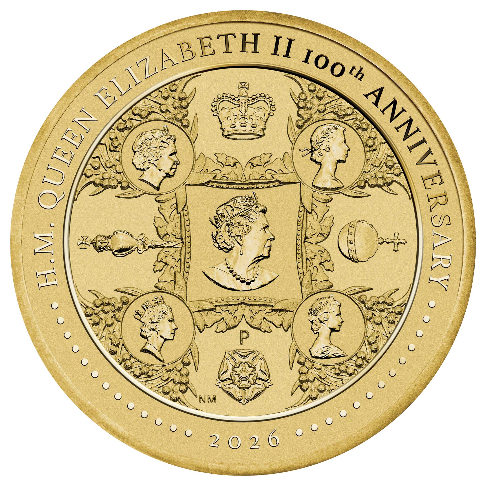 The coin’s reverse includes five effigies of Queen Elizabeth II, each featured on coins produced by The Perth Mint. At the centre is the most recent effigy of Queen Elizabeth II designed by Jody Clark (2019), elegantly framed in an ornate design. Surrounding it are four earlier effigies: Ian Rank-Broadley (1998) at the top left, Raphael Maklouf (1985) at the bottom left, Arnold Machin (1966) at the bottom right, and Mary Gillick (1953) at the top right. Together, these portraits reflect the evolving image of the monarch across seven decades of her historic reign.