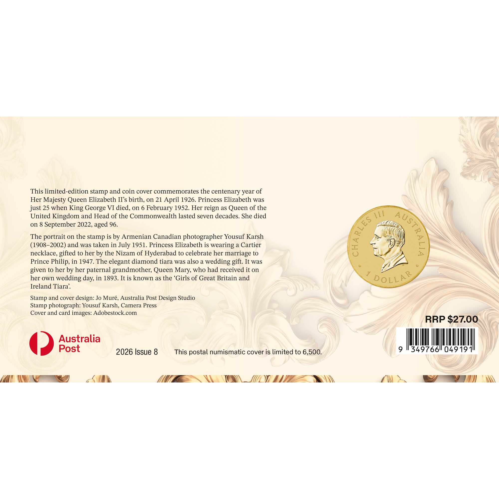 Honour Her Majesty Queen Elizabeth II’s 100th birthday anniversary with this Australia Post stamp and coin cover, featuring a commemorative coin that showcases five royal effigies spanning her historic reign.