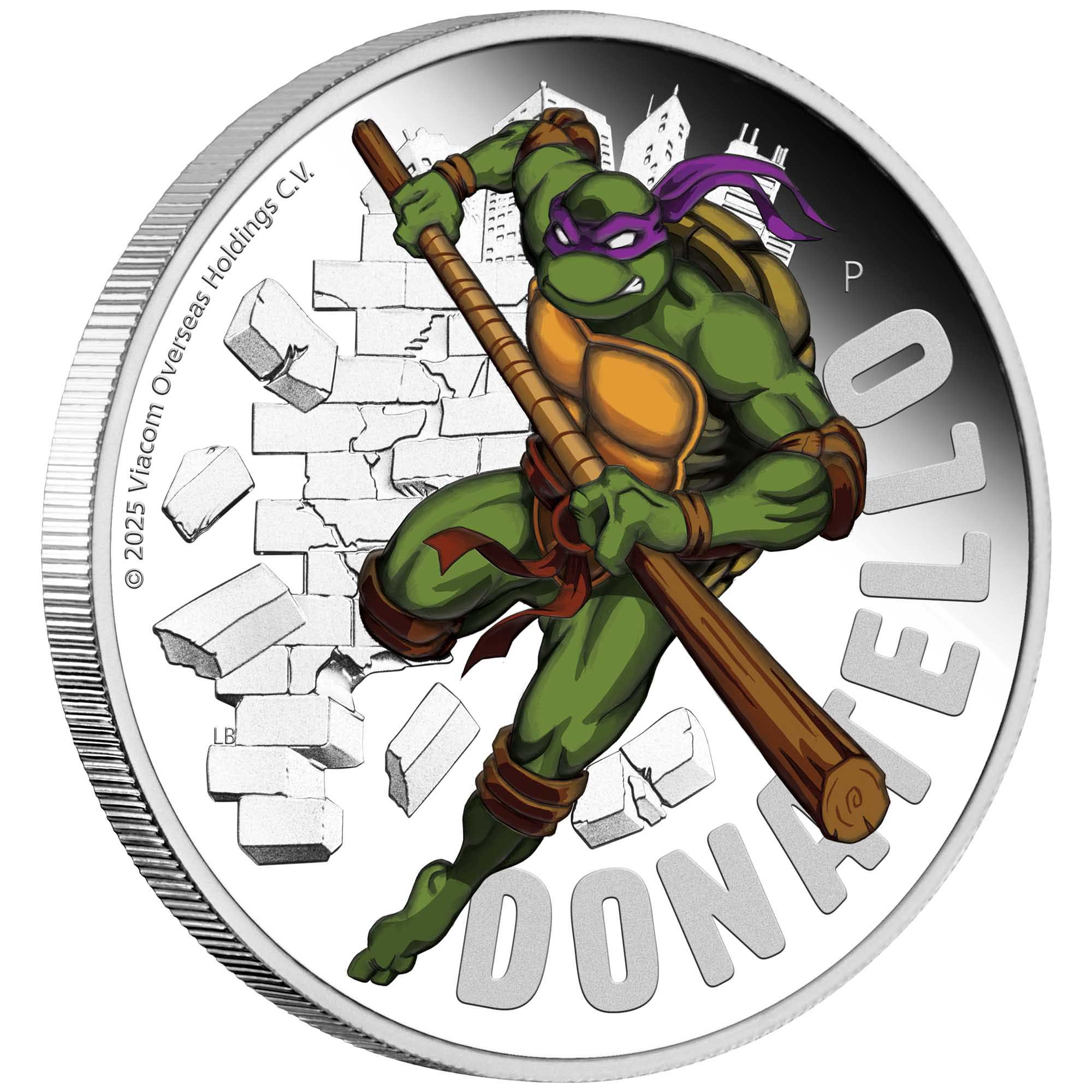 This official licensed 1oz silver proof coloured coin spotlights Donatello, the brains of the Teenage Mutant Ninja Turtles.