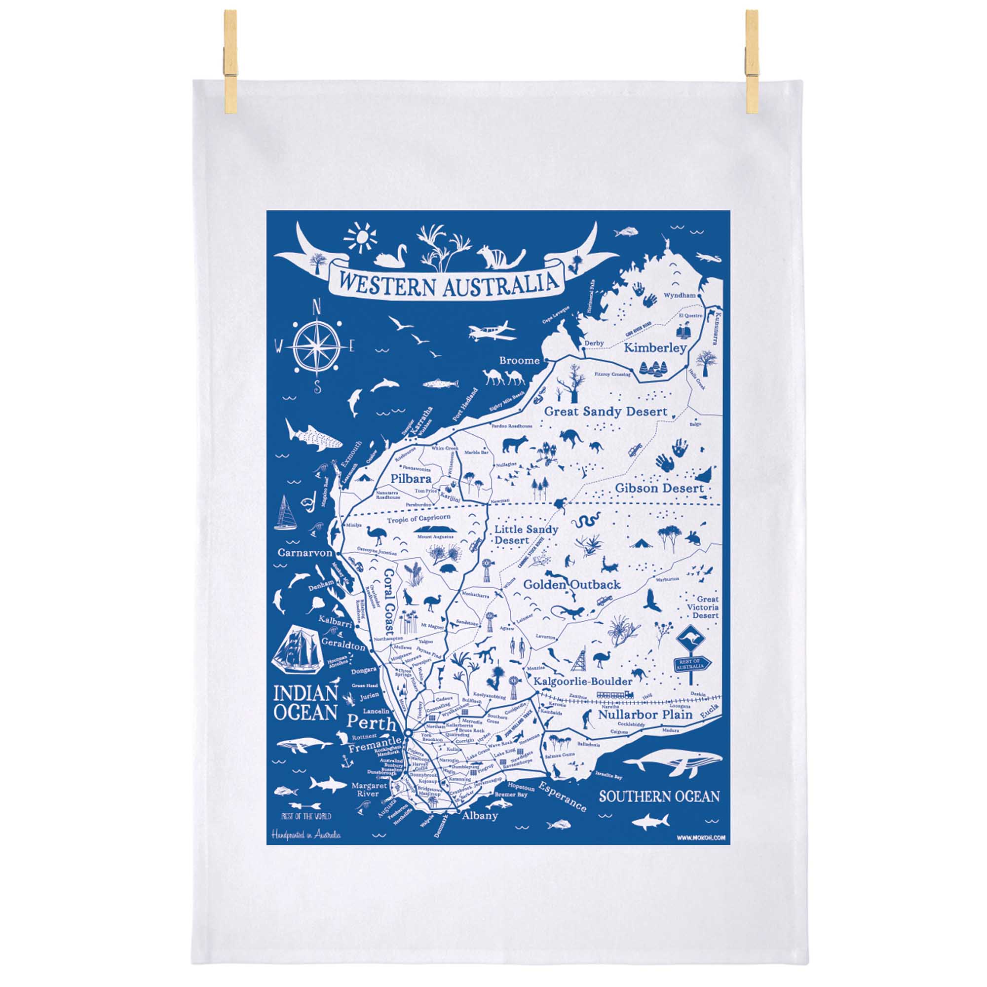 Celebrate the beauty and uniqueness of Western Australia with this charming tea towel. Featuring illustrated designs of iconic landmarks, regions and native animals found in WA, making for a wonderful gift or souvenir.