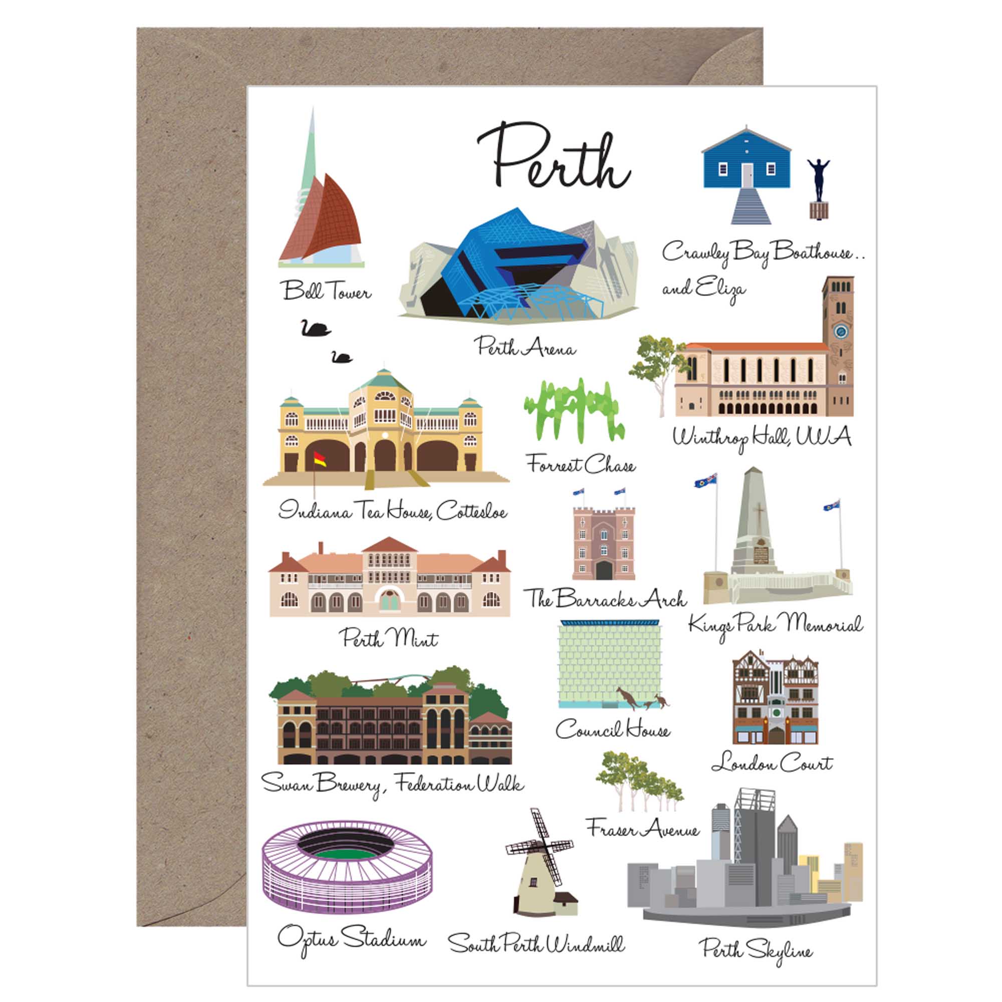 Celebrate the beauty of Perth with this stunning greeting card featuring illustrations of iconic landmarks, including the historic Perth Mint.