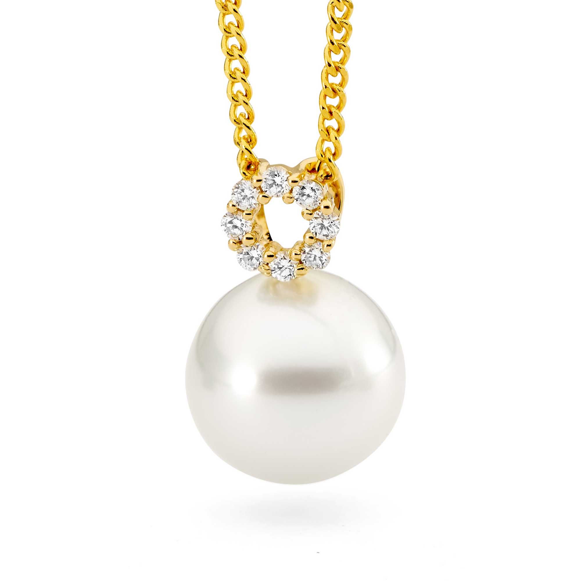 This graceful pendant captures a soft, romantic glow with its luminous white pearl cradled beneath a delicate circle of sparkling white diamonds. Set in warm 18-carat yellow gold, the design blends timeless elegance with a touch of modern radiance.