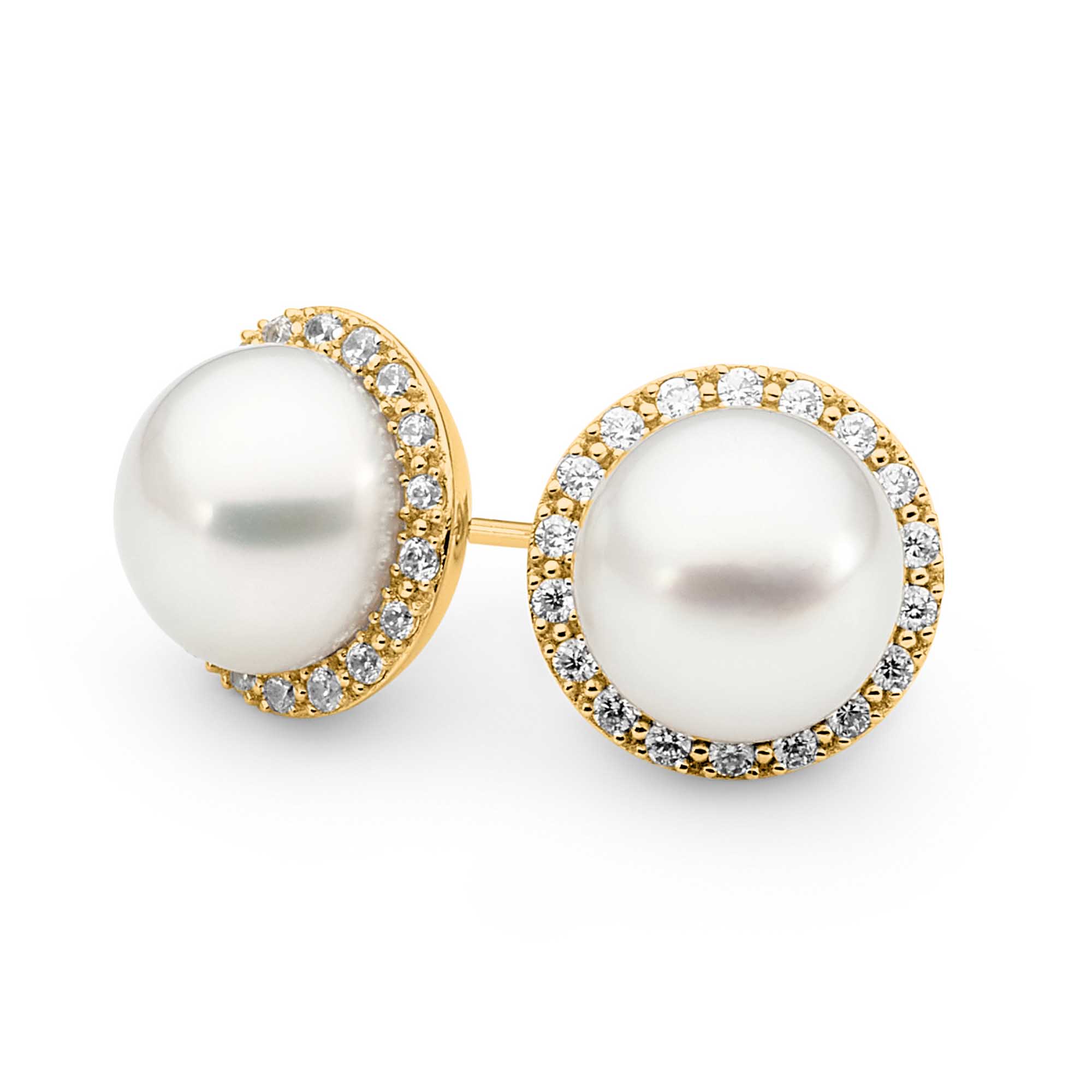 Beautifully framed in warm yellow gold, each earring features a lustrous button pearl accented by a delicate halo of sparkling diamonds, creating a timeless blend of sophistication and shine. Perfect for mum, these earrings are a fantastic gift.