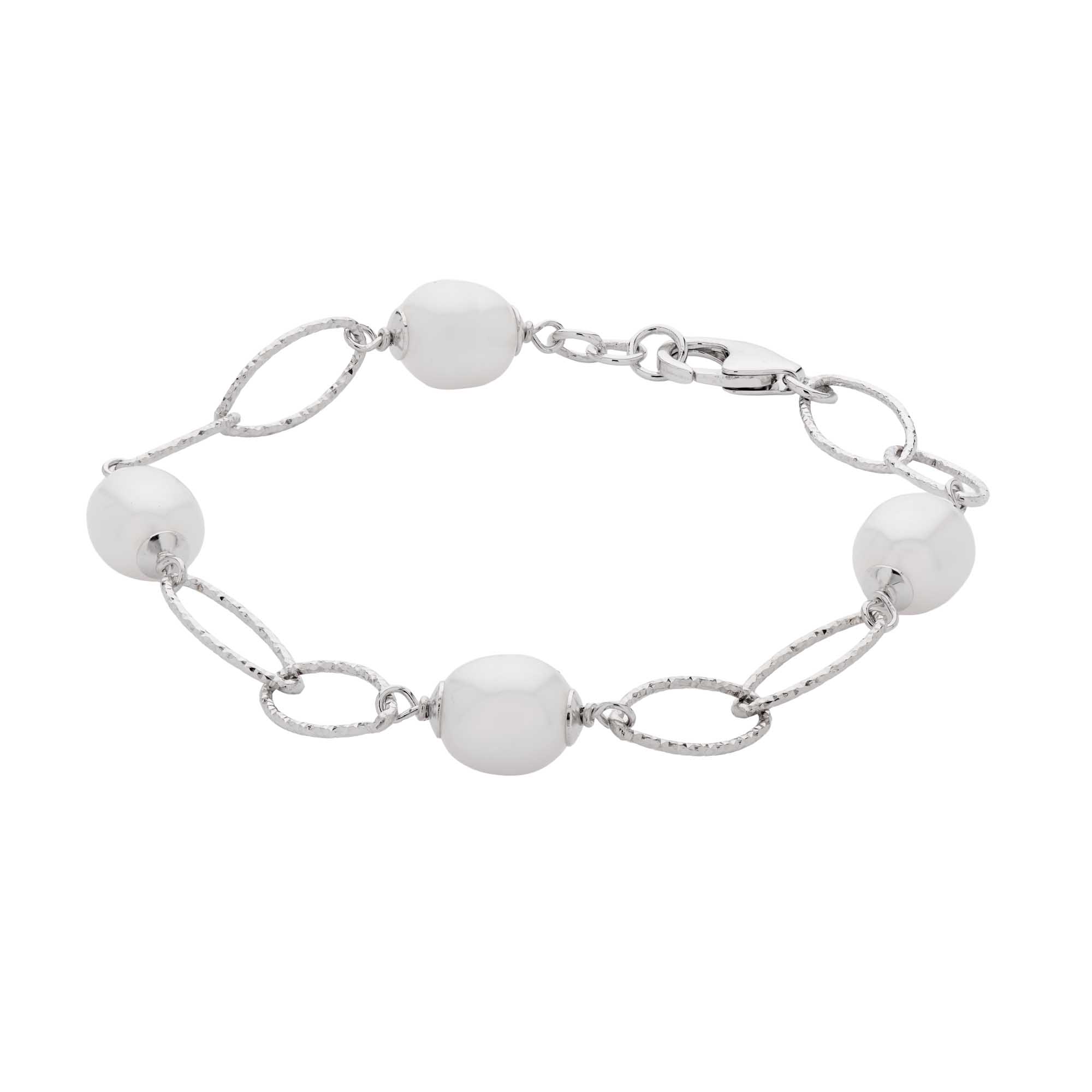 Contemporary and elegant, this 925 sterling silver bracelet features 8-9mm freshwater cultured pearls set between elongated oval links. The alternating sequence of silver links and pearls creates a balanced design that blends modern style with timeless sophistication.